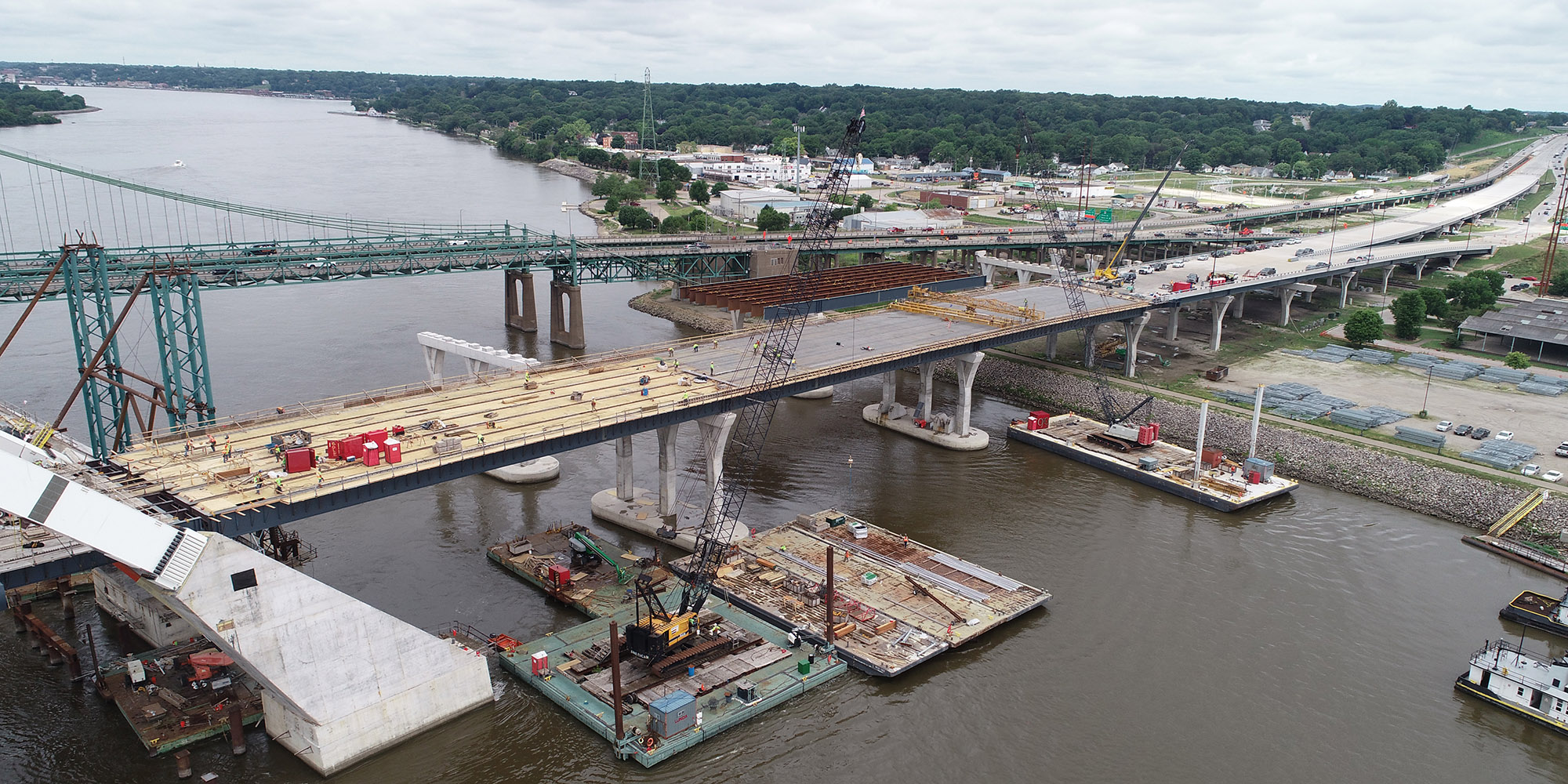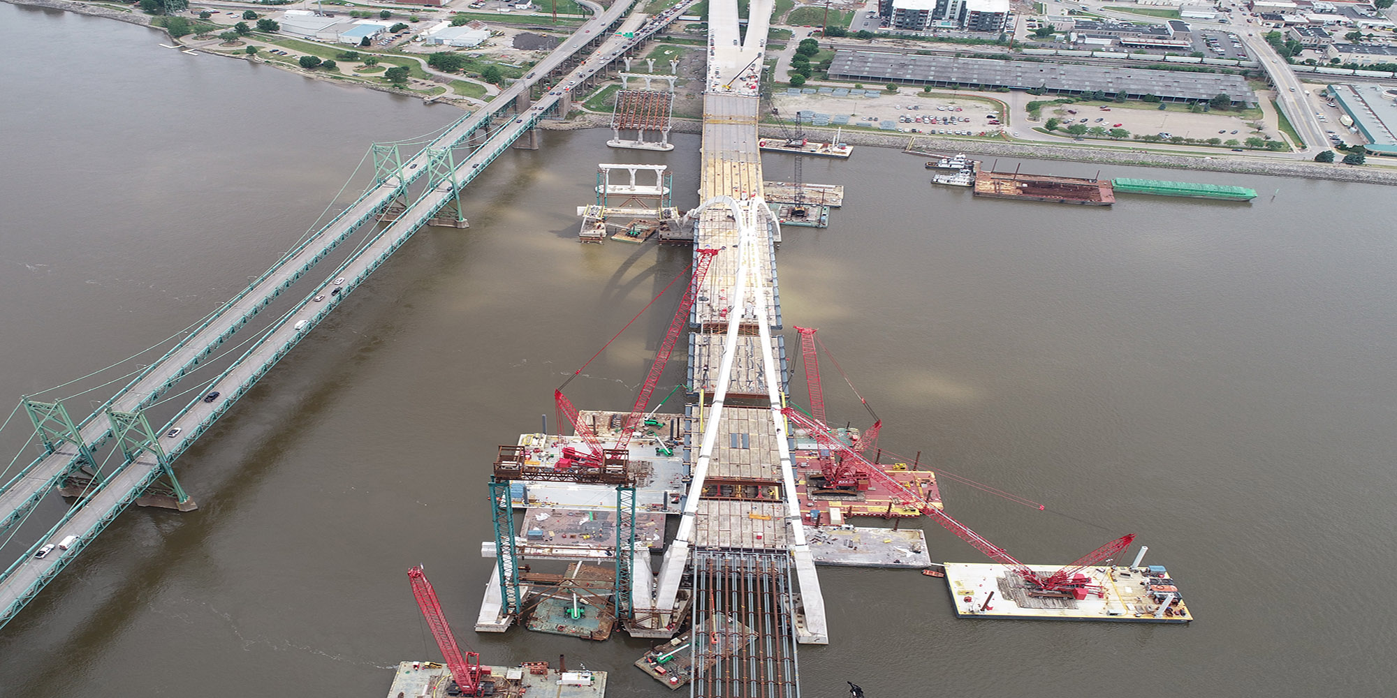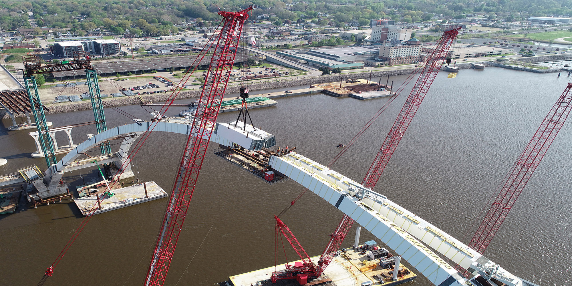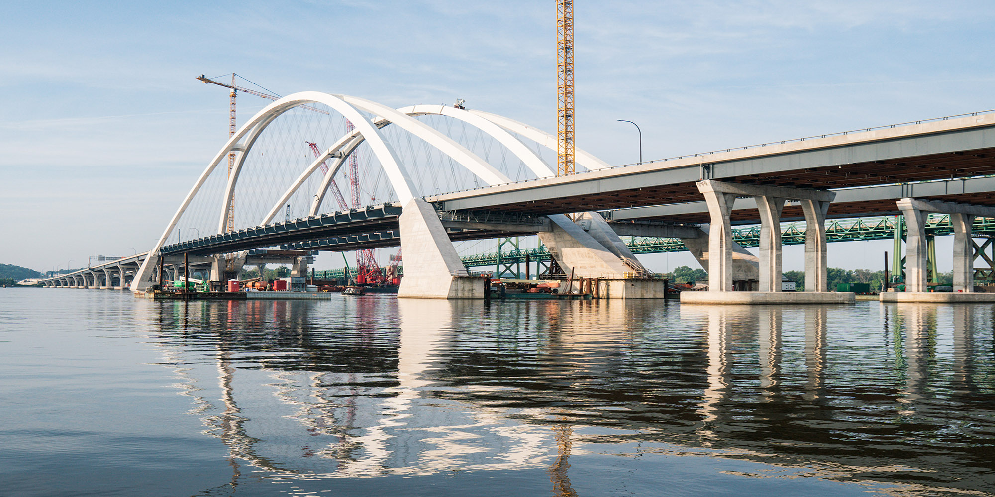 Part of a regional strategy for improving access across the Mississippi River in the Quad Cities, the I-74 Mississippi River Bridge project includes the replacement of the old I-74 over the Mississippi River. Lunda constructed two basket-handle true arches using a tower and stay system that is typically reserved for parallel arches to avoid obstructions to the busy navigational channel of the Mississippi River. The 800-foot basket handle arches are the longest basket handle true arches erected in the United States and one of very few erected in place. The bridge is more than twice as wide as the old bridge and includes a multi-use path on the bridge that will connect to paths in Bettendorf and Moline. The project also features roadway and aesthetic lighting on and underneath the bridge structures, and a scenic overlook with connections to added pedestrian and bike paths. The bridge is expected to carry 100,000 vehicles per day by the year 2035.
