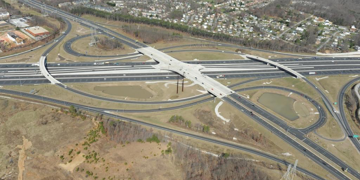 This project consisted of the reconstruction of 1.6 miles of an existing eight-lane highway to eight general purpose and four express toll lanes separated by concrete traffic barriers. Also included was the realignment and widening of MD 43 from four to six lanes for 1.1 miles through the interchange, construction of three bridges, two flyover ramps, roadway grinding and resurfacing, full depth roadway replacement, storm drain improvements, box culvert extensions, retaining and noise walls, stormwater management facilities, landscaping, signage, pavement markings, lighting, traffic signals, toll gantries, and utility improvements/relocations.