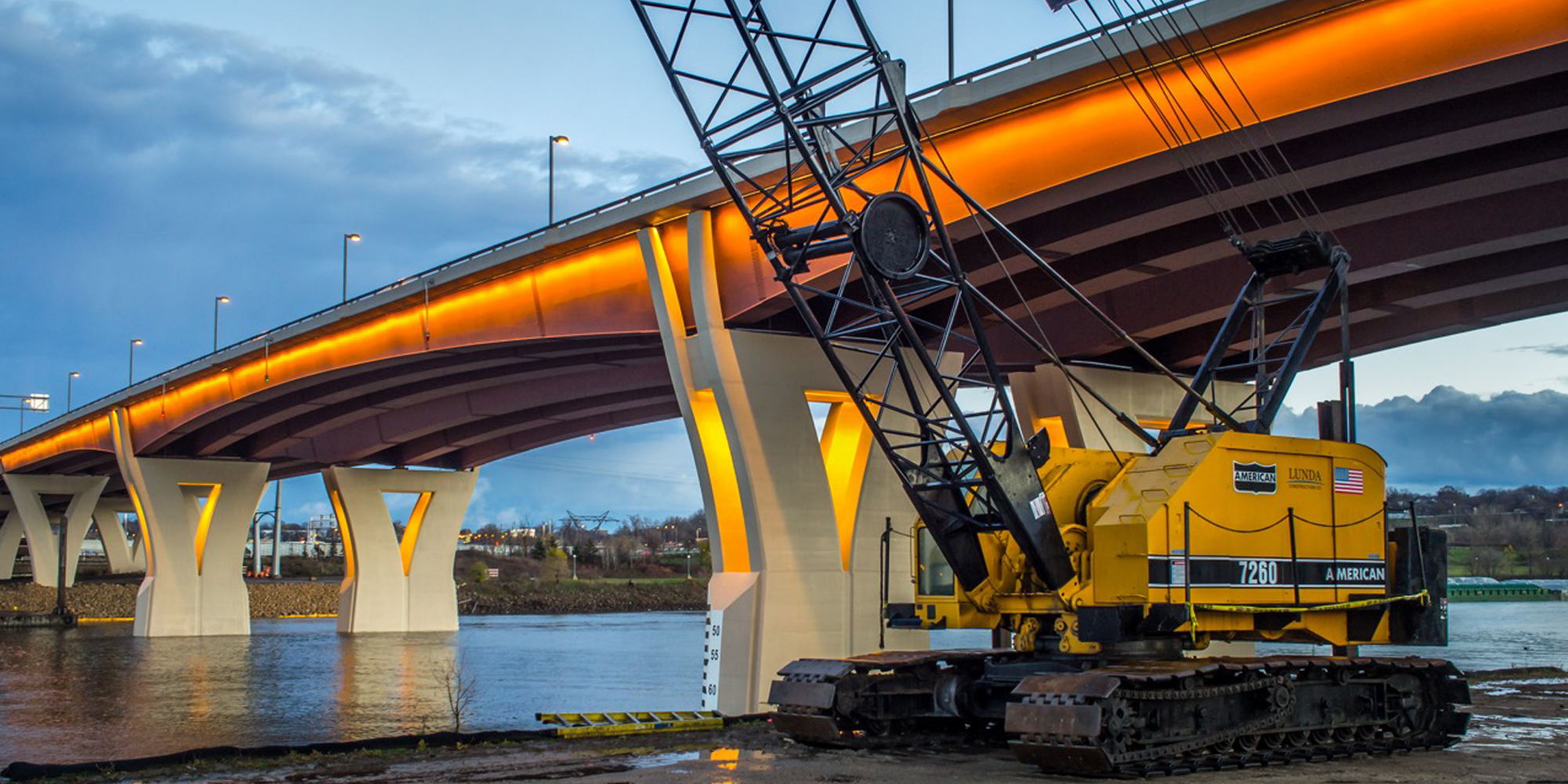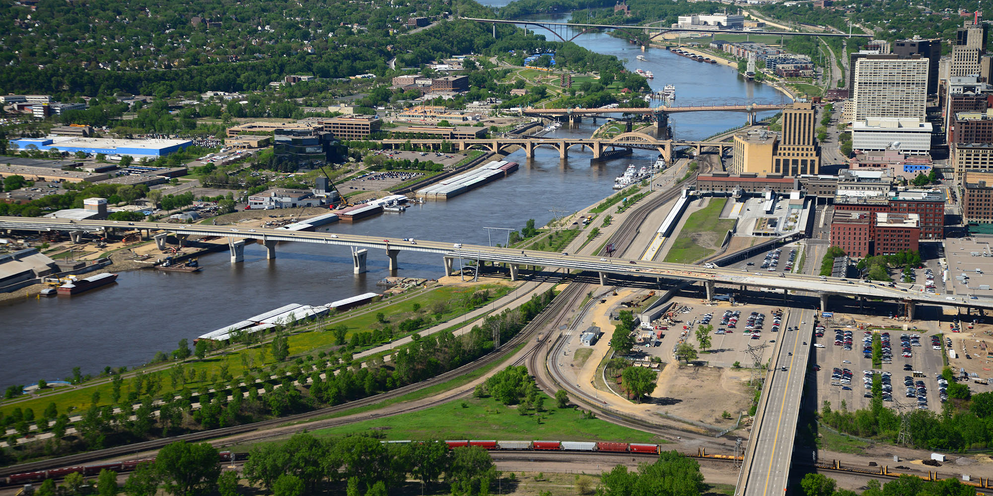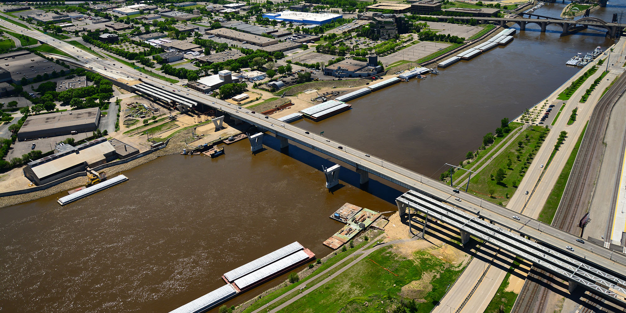 The project includes Bridges 62018 and 62017 that are each 3,209 feet long, 14 span structures with a 362-foot main span over the Mississippi River. Work activities on these structures included cofferdam installation, 42-inch OD pile driving, substructure construction, structural steel fabrication, structural steel erecting, and superstructure construction. The river piers are located on the edges of the Navigation Channel and required considerable coordination with the United States Coast Guard as well as the local stakeholders that move freight through this section of the river. To accomplish this, Lunda developed navigation plans that were reviewed and approved by the Coast Guard and local stakeholders. During the construction engineering and planning phase of the cofferdam designs, Lunda considered all the risks associated with the fluctuating water elevations of the river and designed the cofferdams to an elevation that would allow them to continue working (unless there was a major flood event). The work required that Lunda coordinate with the Corps of Engineers and City of St. Paul, as four of the land piers were located in flood protection levees. The Corps and City did not want the levees compromised, thus, Lunda developed means and methods to work over the top of the levees, which allowed the work to be completed without any impacts.