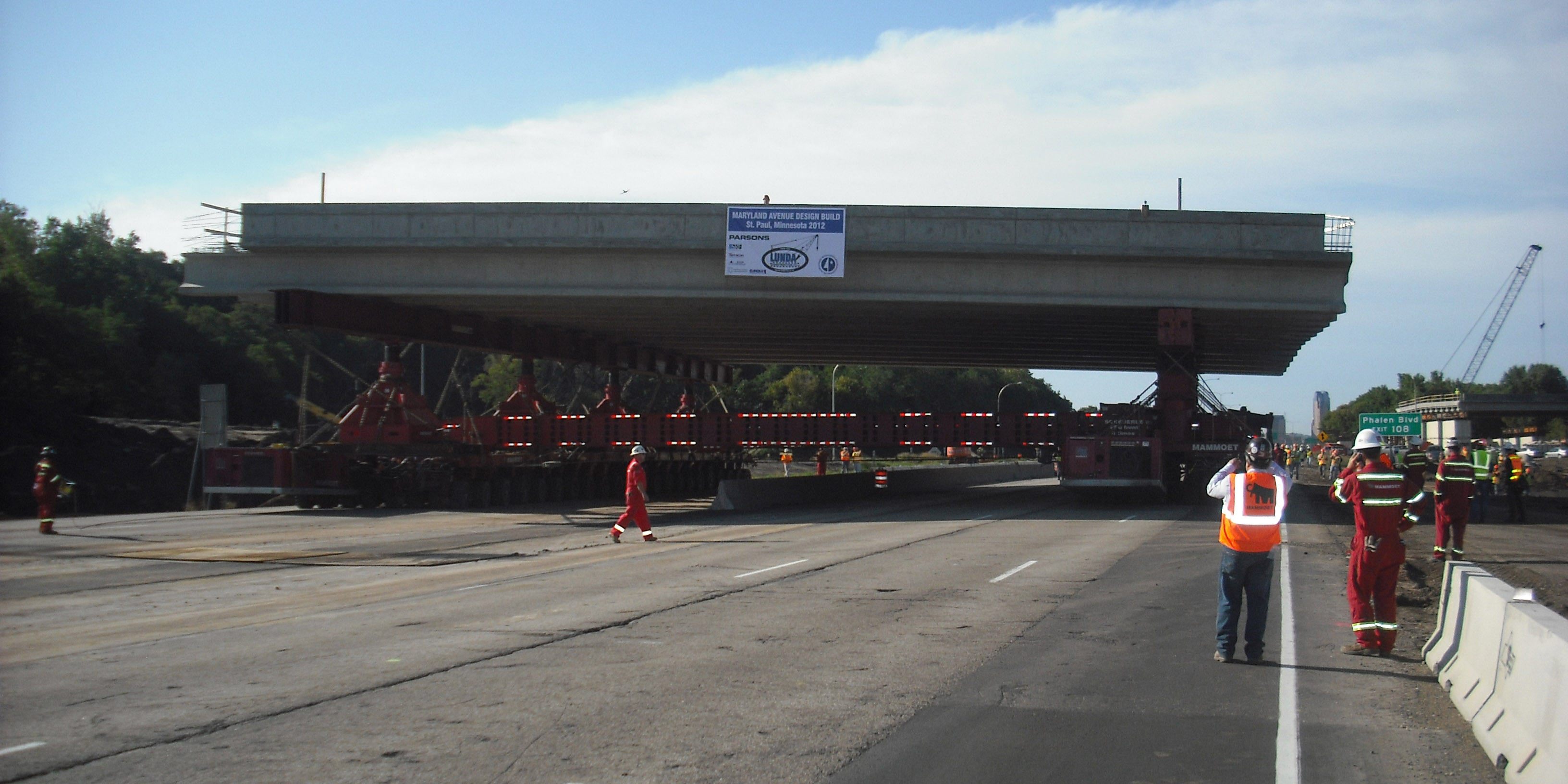 The bridge was moved into place using SPMTs in one move operation for each span. Each 105-foot span weighed more than 2.6 million pounds and had to be transported 1,000 feet, which took about two hours each to move into place. The project also included approach roadway off-ramp reconstruction, drainage, traffic control, the Gateway Trail pedestrian tunnel under Maryland Avenue, and utility relocation. The bridge opened for traffic on time, providing room for the Cayuga I-35W auxiliary lanes.