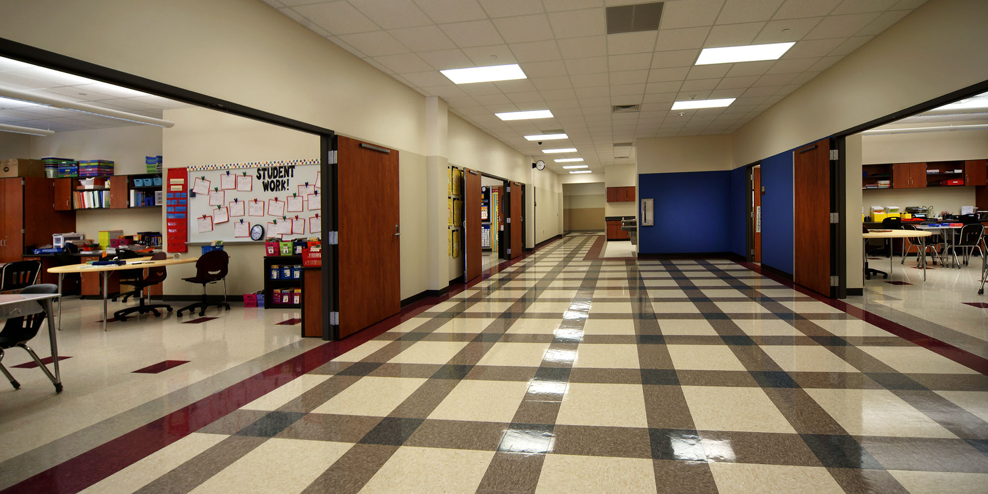 This project consisted of a 232,938-square-foot school campus with athletic fields and associated parking areas designed to house 2,400 students. The campus incorporates five buildings connected by walkway canopies centered around a learning area courtyard. The intermediate school contains 58 classrooms, library and administration for Grades 3-5. The middle school contains 61 classrooms, library and administration for Grades 6-8.