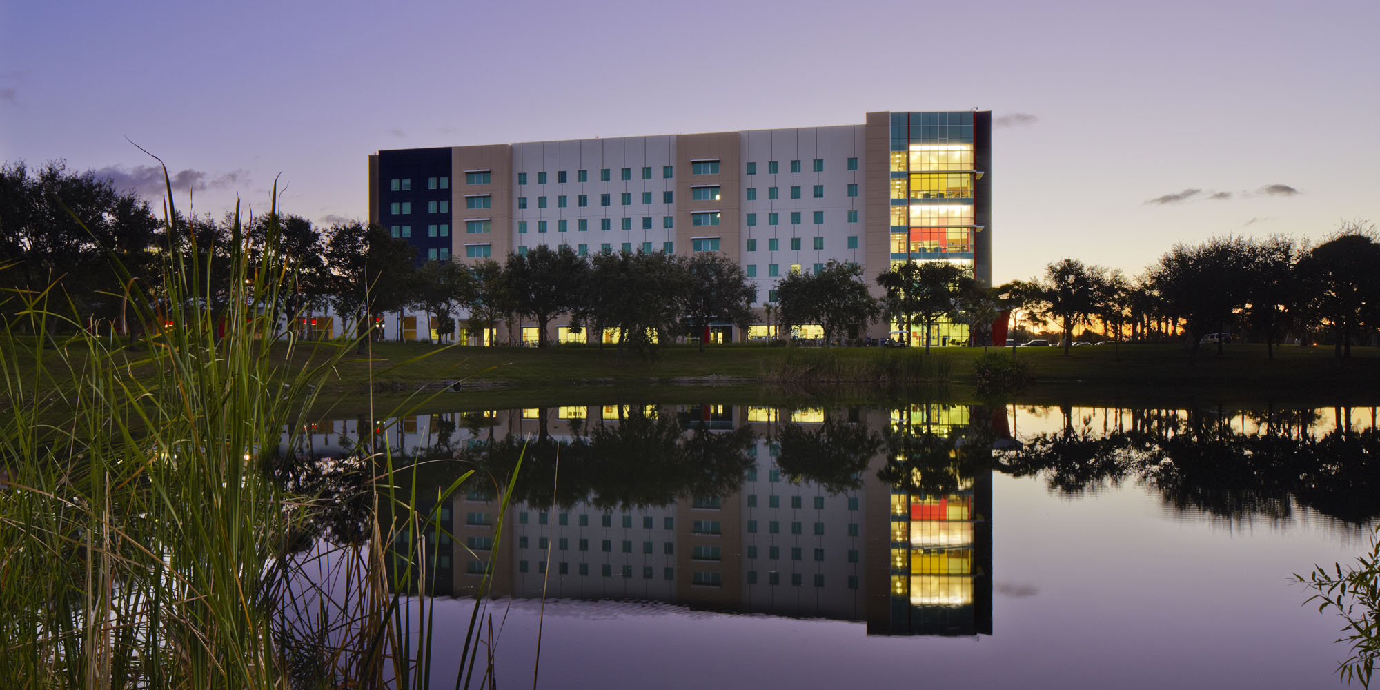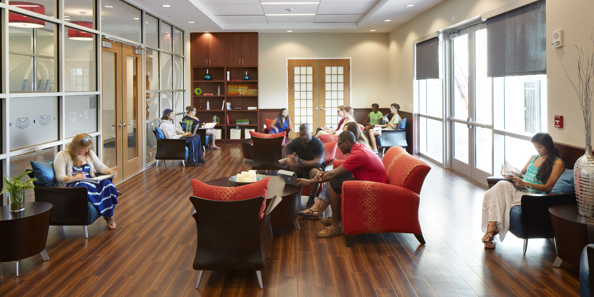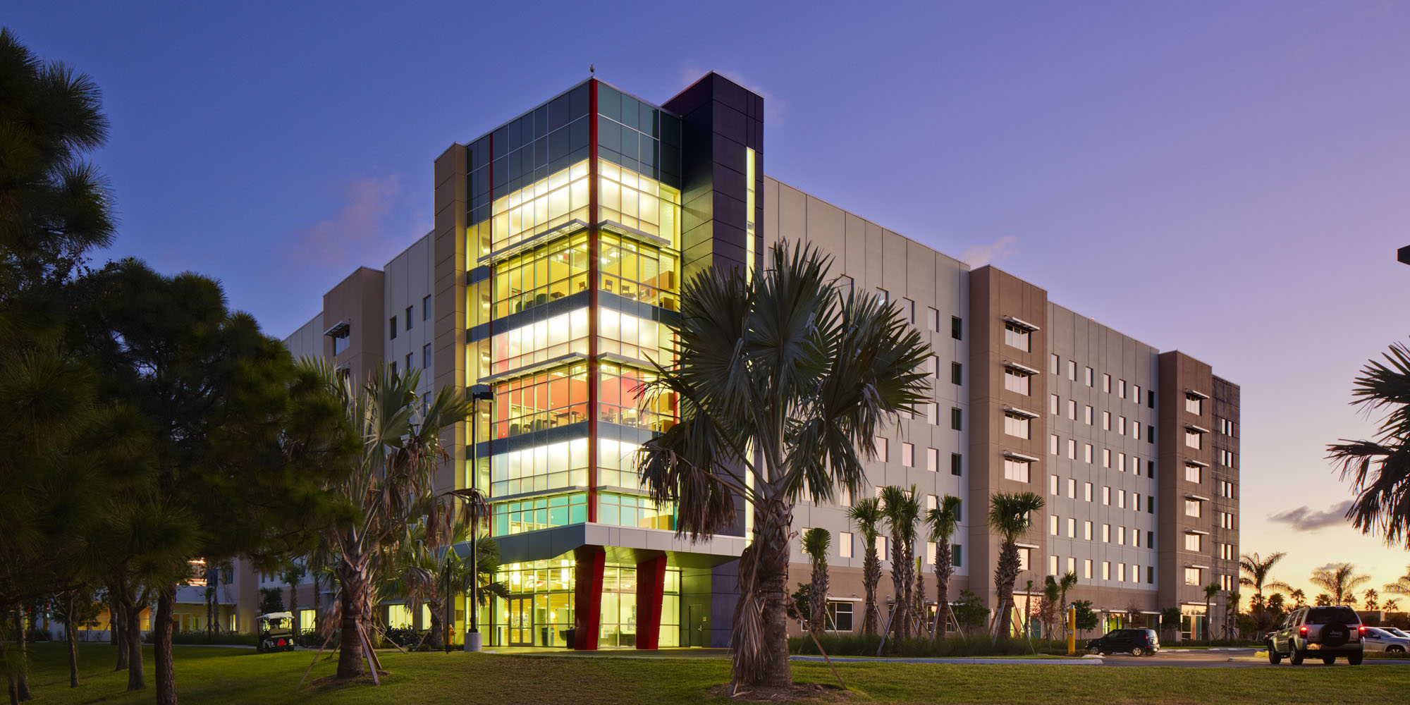 The project consisted of one 7-story building containing a combination of four bedrooms/two bath, two double bedroom/two bath units for a total of 620 beds with amenities targeted at freshmen students. Additionally, this facility houses the resident advisors, resident coordinator, housing coordinator, and faculty in residence. Components include an elevator lobby, activity room, mail room, computer laboratory, event room, fitness room, laundry facilities, study rooms, multipurpose room, two-story student lounges, conference rooms, classrooms, support areas, offices, storage rooms, mechanical rooms and service zone areas. A unique feature of this facility is that it also contains a food service venue with two to three retailers providing healthy dining options for the students at all hours of the day.