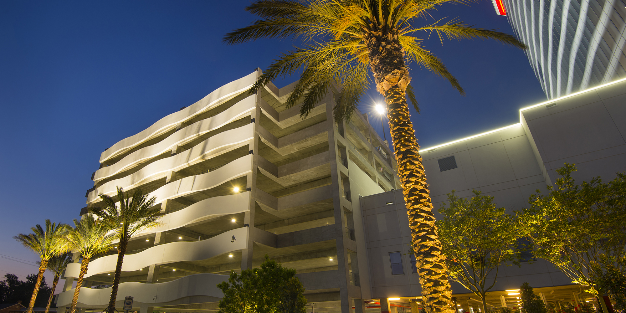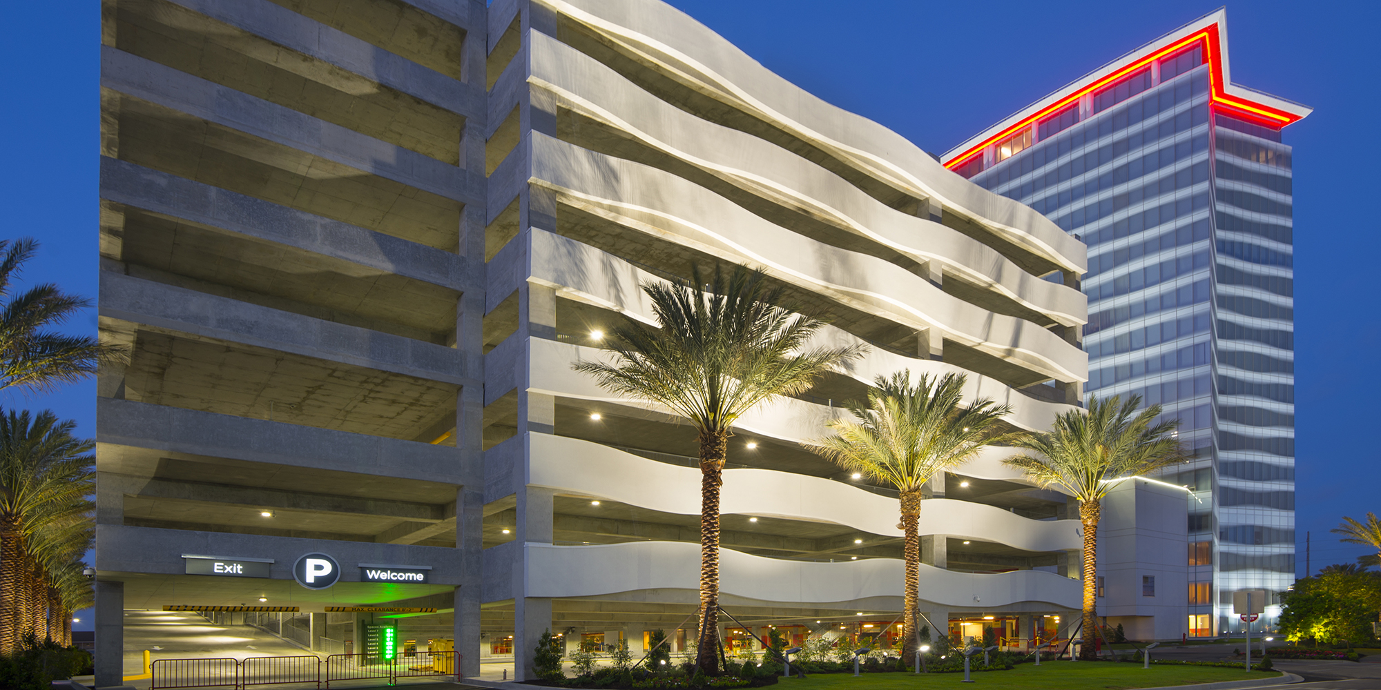 This resort includes an 18-story hotel tower with 234 guestrooms, 56 suites, and 10 penthouse suites. The 161,000-square-foot podium level includes the gaming space, administrative space, hotel lobby, back-of-house, an event center, a gift shop, and four café/restaurant venues, plus supporting facilities. In addition, the bulk of the HVAC equipment is situated on this level. The site improvements consisted of underground utilities, an architectural retaining wall, concrete paved loading dock area, asphalt paved roadways, 1,800 parking spaces, site lighting and landscaping. In addition, there is a 4,400-square-foot in-ground pool and hot tub, plus 3,500 square feet of pool deck, an outdoor bar, and miniature-golf course with a volcano and water feature. The hotel tower vertical face is comprised of panelized curtainwall units with metal panels and includes small and large missile impact glass, while the podium level is enclosed with barrier-type EIFS and additional sections of curtainwall units.