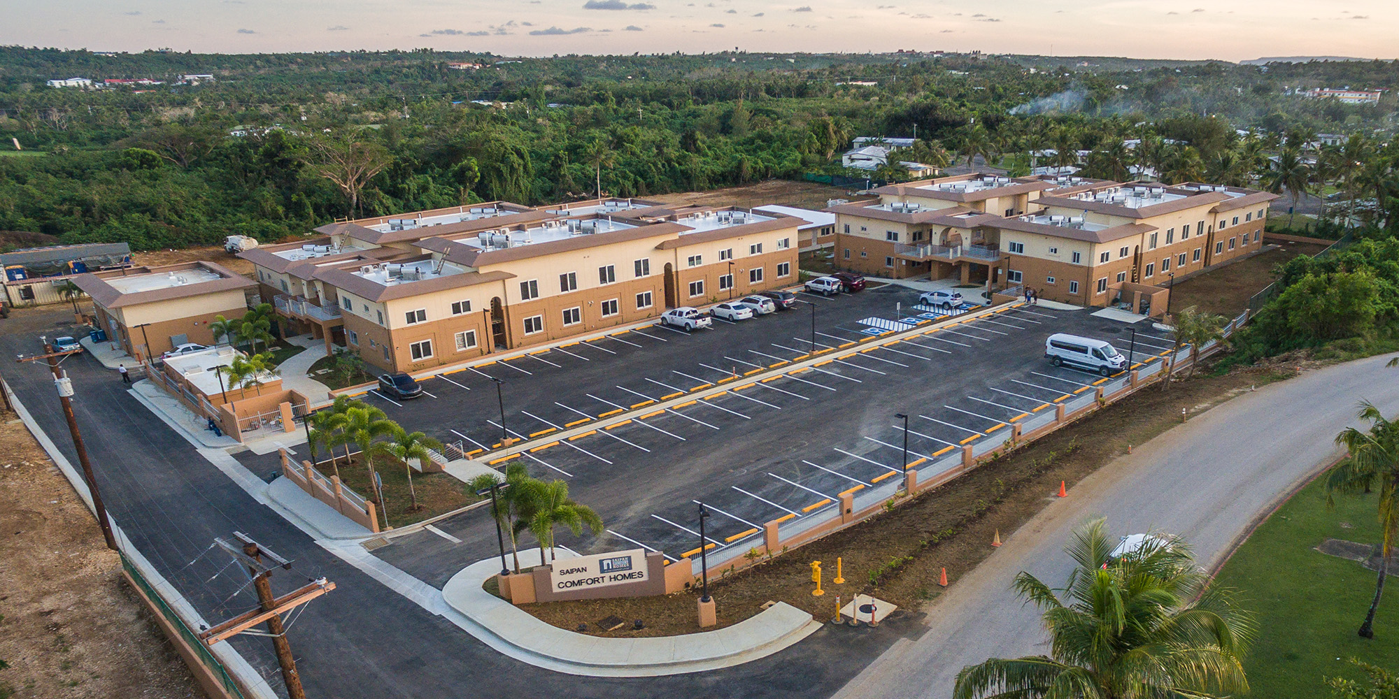 The project consisted of 40 two-bedroom apartment units of approximately 1,000 square feet each. Site work included earthwork, site utilities, paved parking, sidewalks and stairs, utilities including off-site, water storage tanks, and other site improvements. Building work included precast concrete walls and elevated slabs, roof membrane, metal fabrications, thermal and sound insulation, non-structural metal framing, carpentry, gypsum board walls and ceilings, ceramic tile, aluminum windows, glazing, wood and fiberglass doors and frames, door hardware, cabinetry and fixtures, signage, equipment, painting, typhoon shutters, fire detection system, electrical, ventilation and air conditioning, plumbing, fire protection, generator, and landscaping.