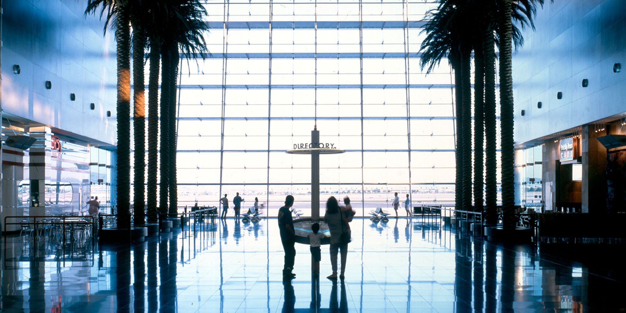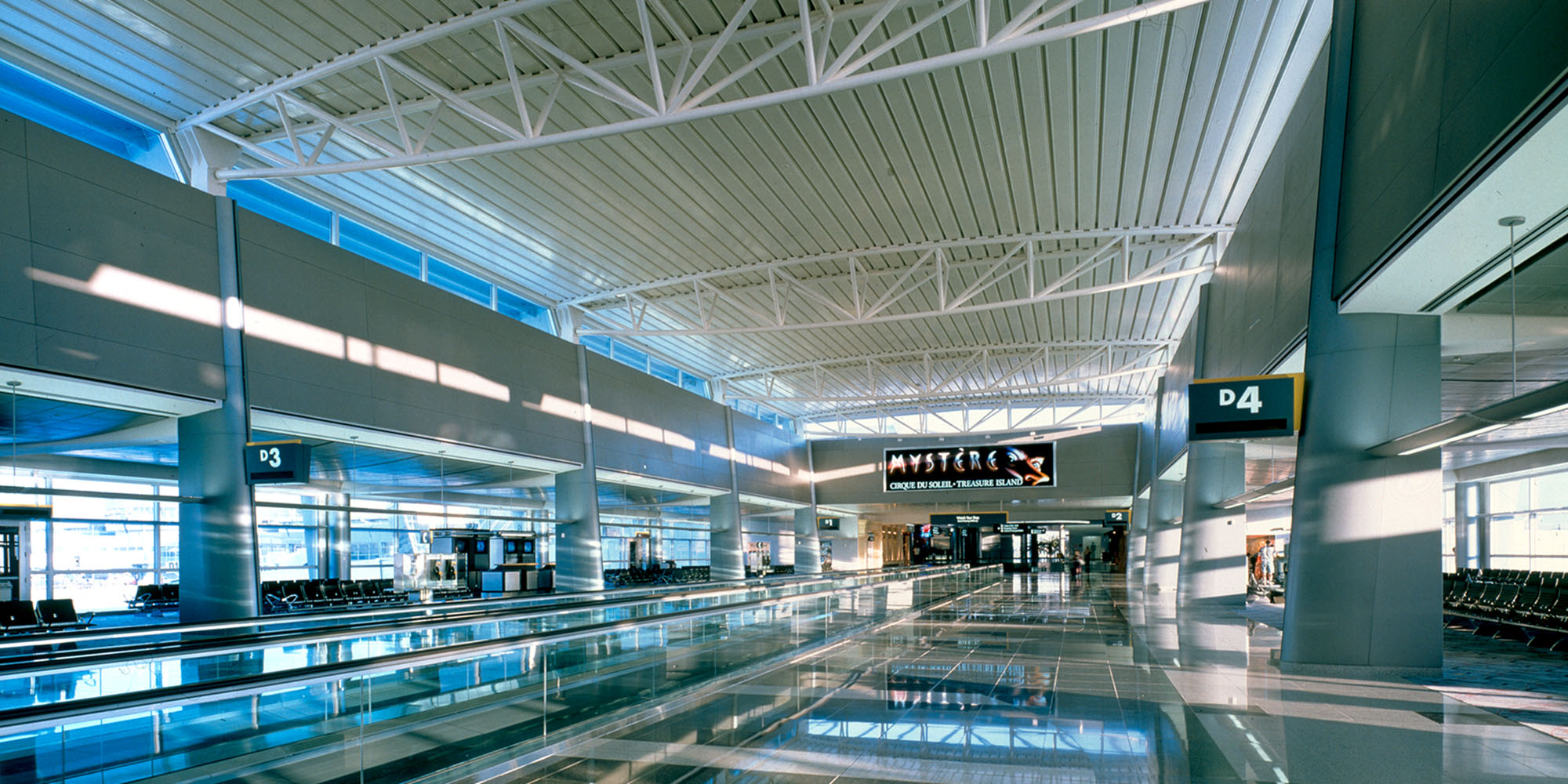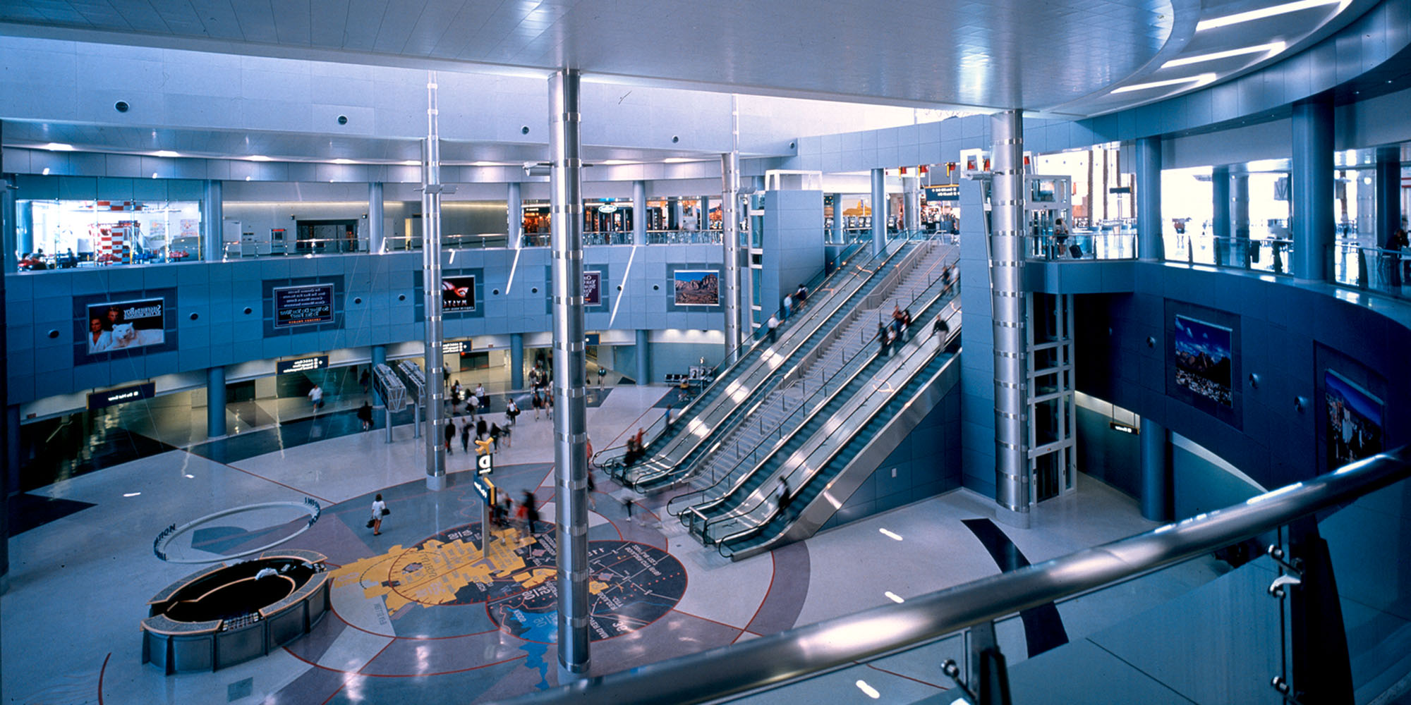 This satellite D Gates concourse is a 684,000-square-foot steel and glass facility with two wings and 26 gates. Two glass elevators, four escalators and stairs provide access from the Rotunda to the Great Hall, the building’s centerpiece, which features a 90-foot by 50-foot wall of double-paned glass windows overlooking the runways and surrounding valley. The building also features many retail shops, restaurants and a children’s entertainment area.