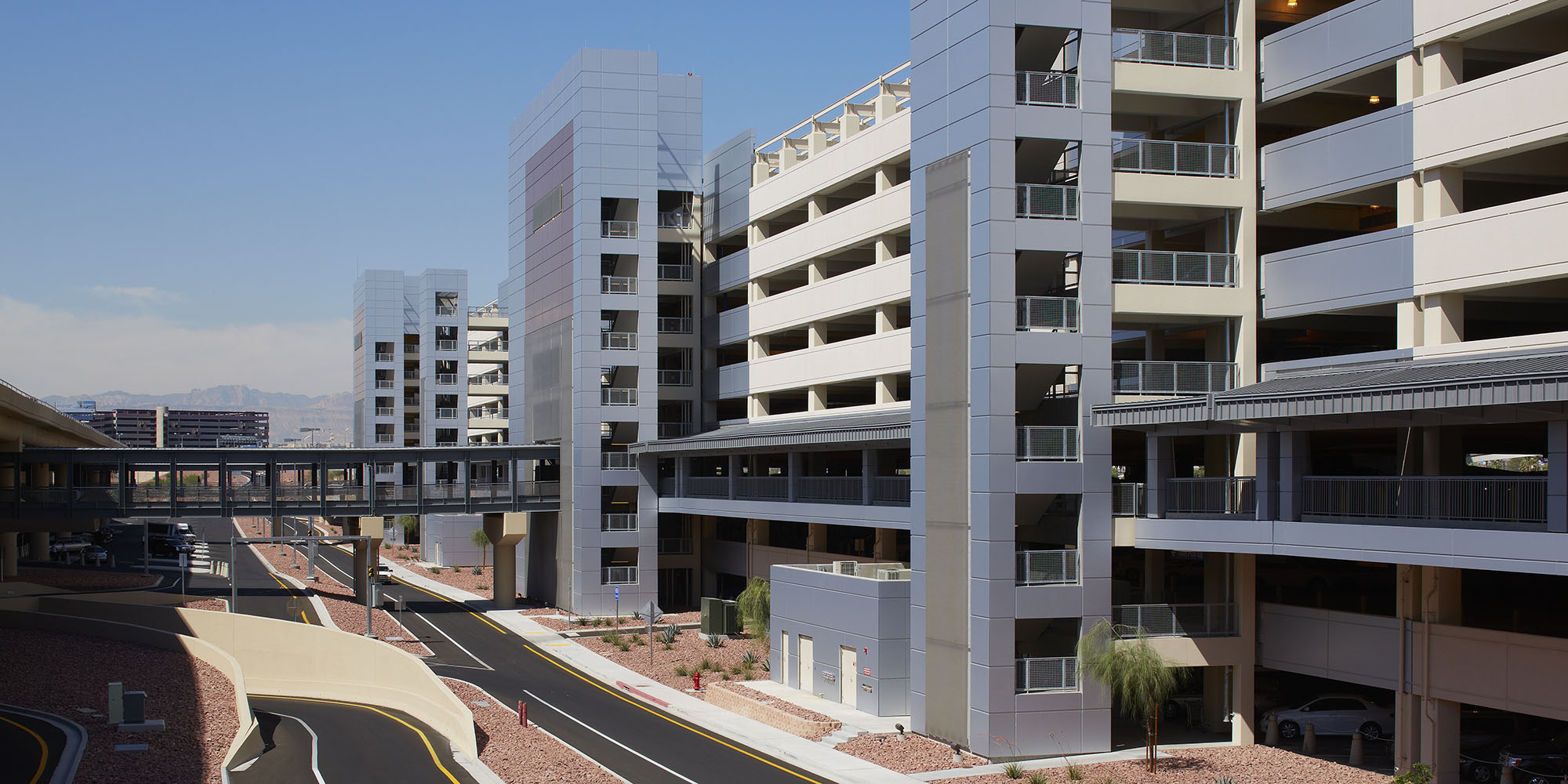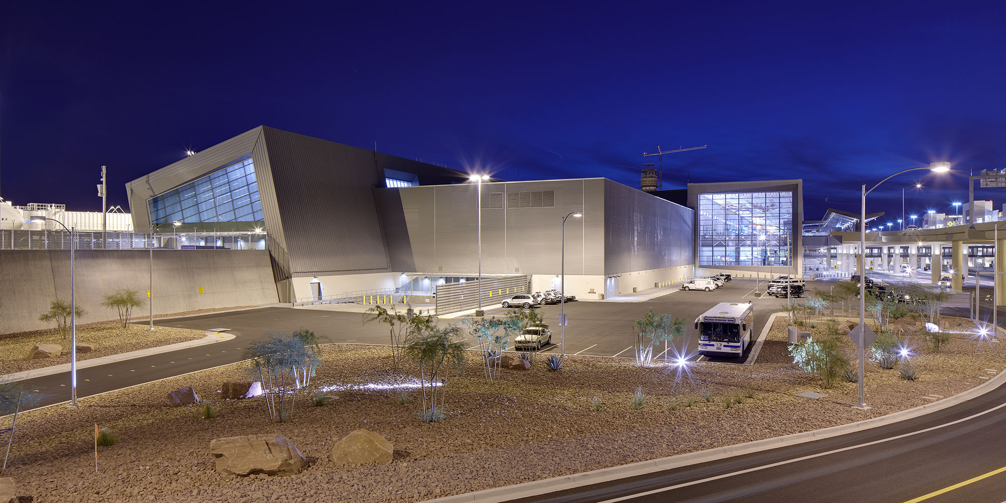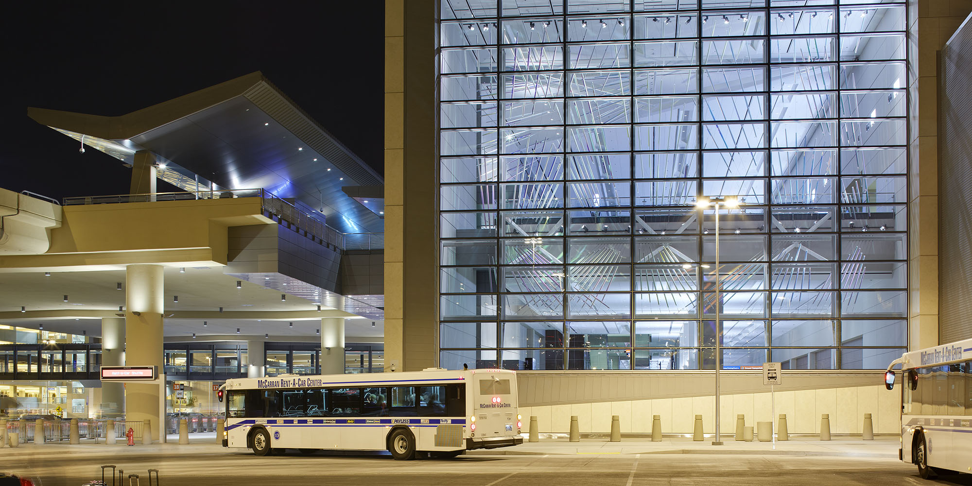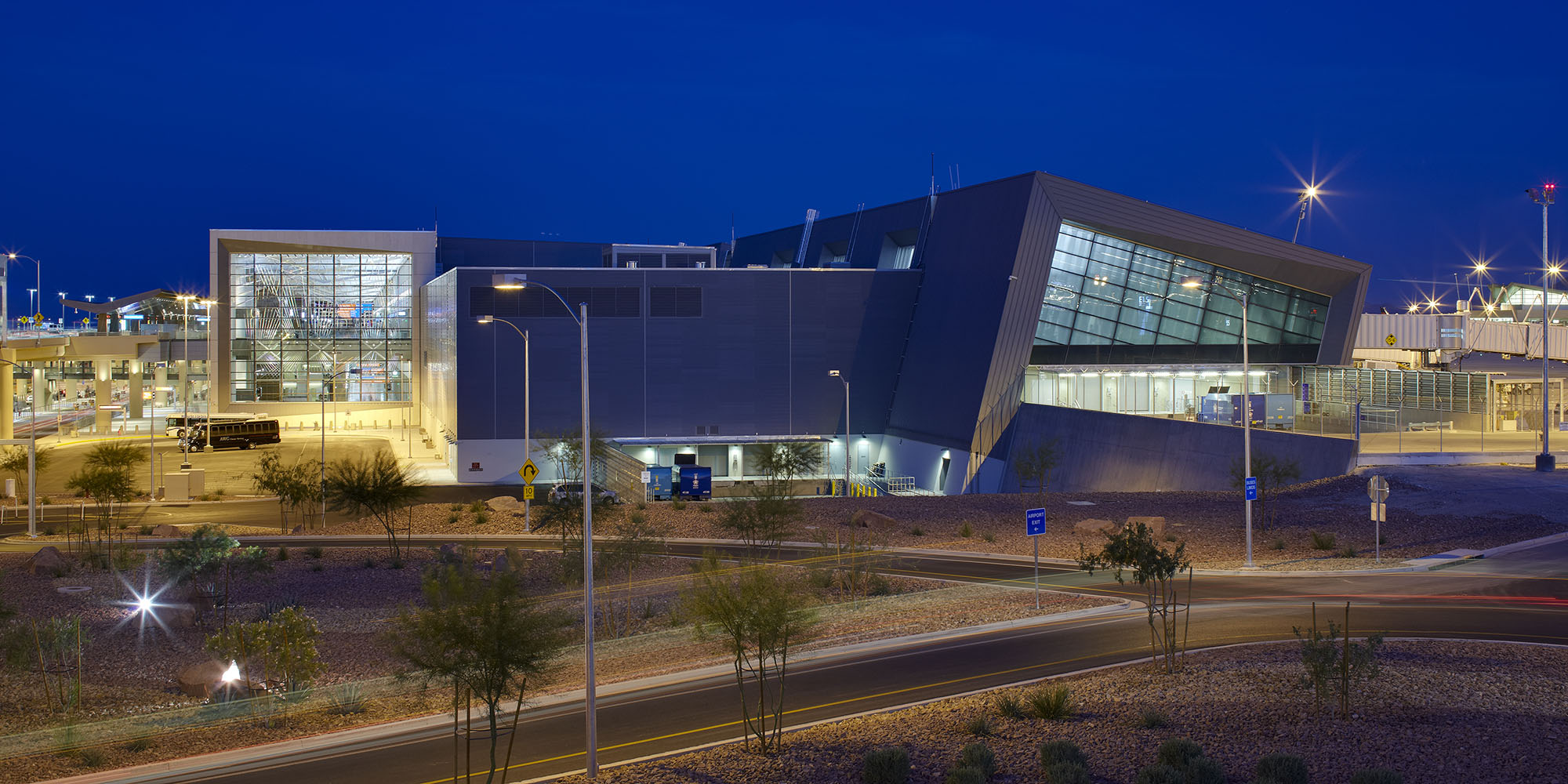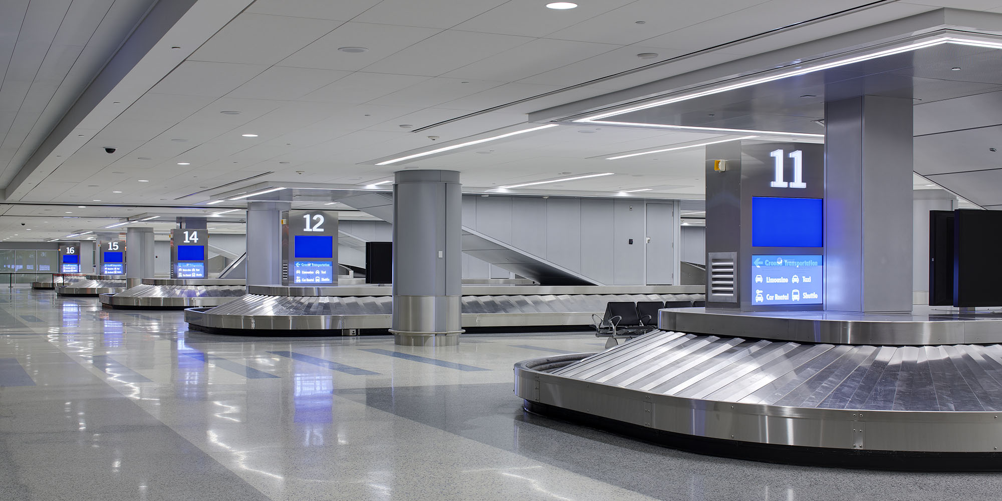 The 1,900,000-square-foot terminal building includes a basement, three upper levels and roof-level penthouses. The building houses a baggage handling system for outbound and inbound processing, and an in-line explosives detection system for baggage screening. The building’s infrastructure is designed with extensive cabling for software interfaces. Other features include dynamic and static signage, way finding systems and Voice-over-Internet Protocol (VoIP). The elevated roadway extends the length of the terminal – approximately 90 feet wide and 2,000 feet long. Construction of the elevated roadway included a concrete box girder with cast concrete columns.