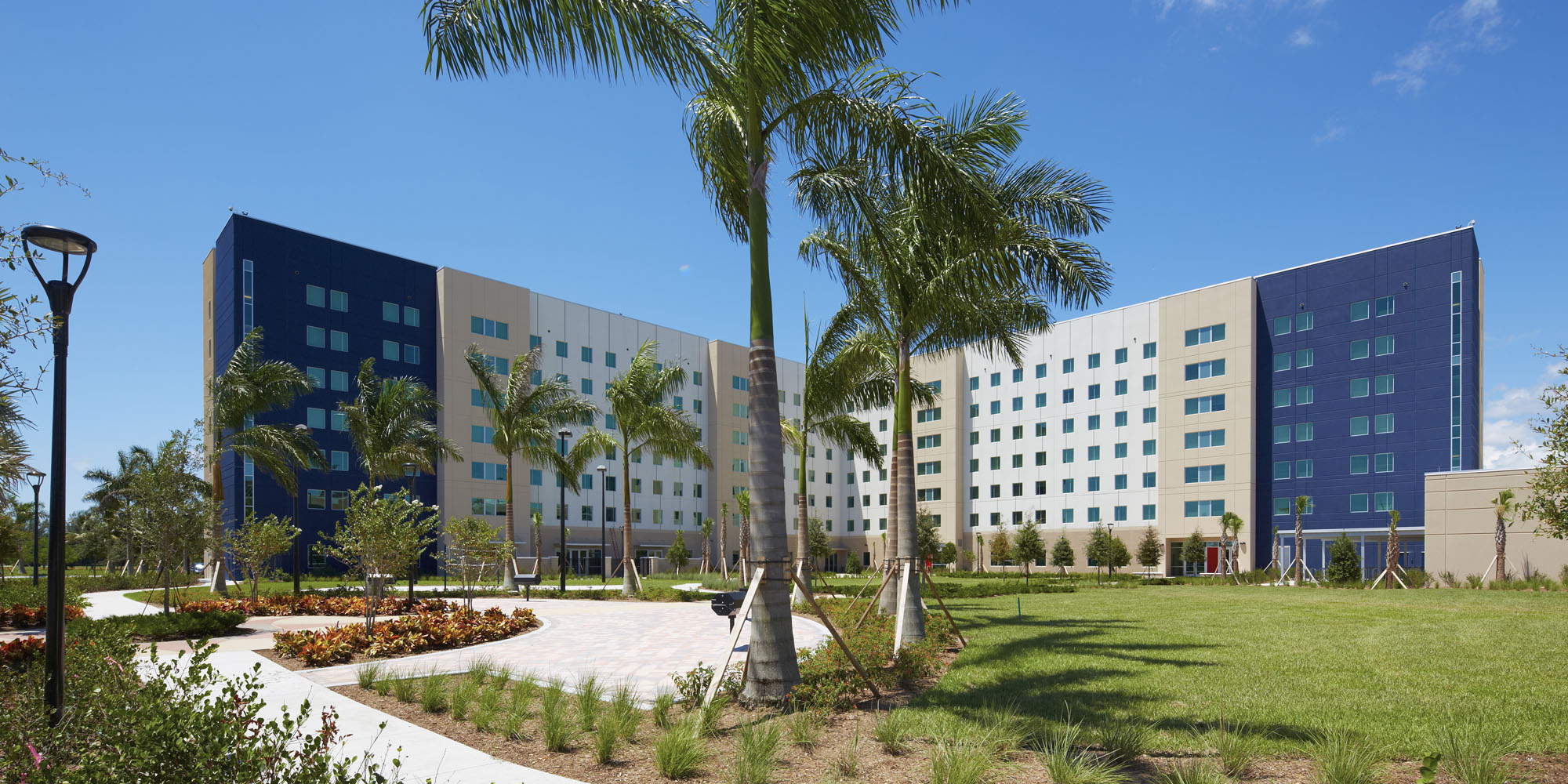 The project consisted of one 7-story building containing a combination of four bedrooms/two bath, two double bedroom/two bath units for a total of 620 beds with amenities targeted at freshmen students. Additionally, this facility houses the resident advisors, resident coordinator, housing coordinator, and faculty in residence. Components include an elevator lobby, activity room, mail room, computer laboratory, event room, fitness room, laundry facilities, study rooms, multipurpose room, two-story student lounges, conference rooms, classrooms, support areas, offices, storage rooms, mechanical rooms and service zone areas. A unique feature of this facility is that it also contains a food service venue with two to three retailers providing healthy dining options for the students at all hours of the day.
