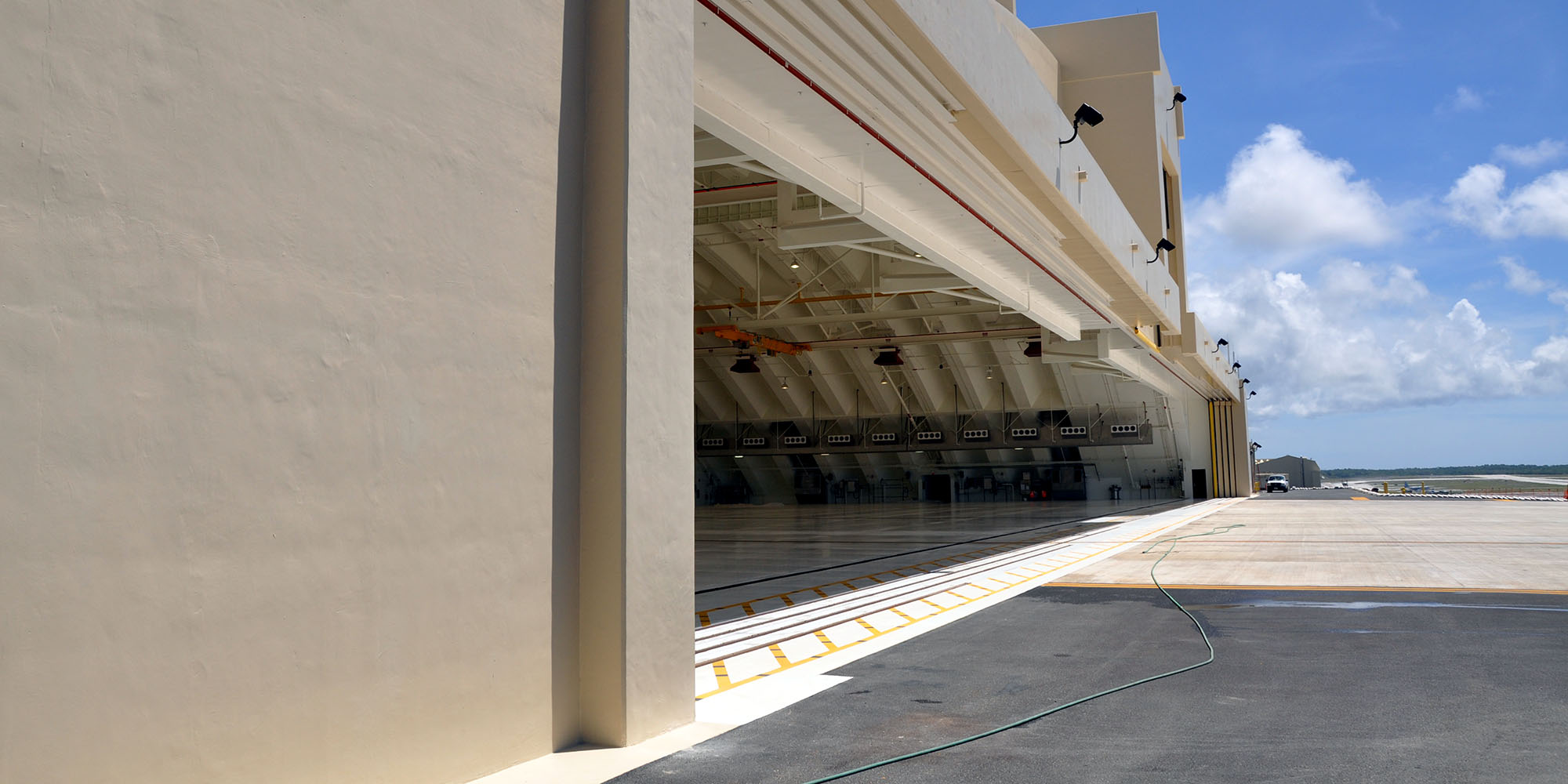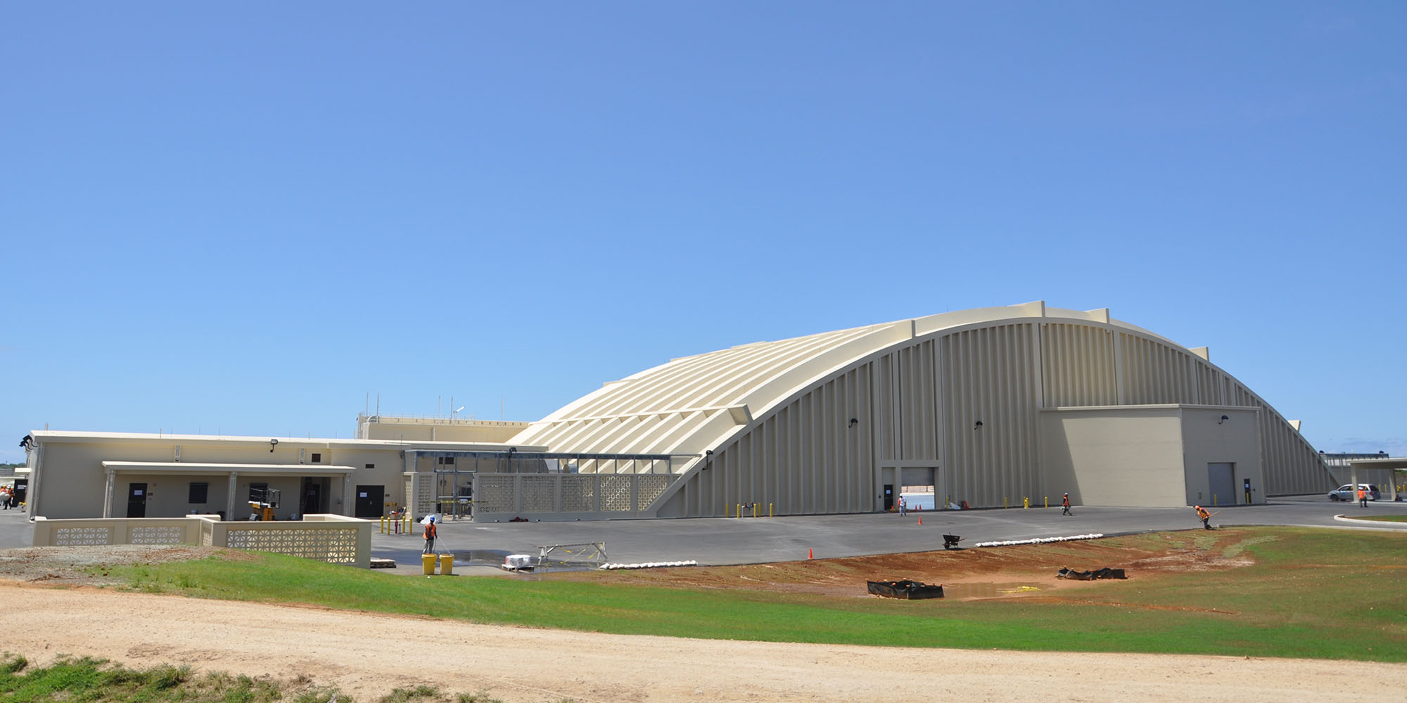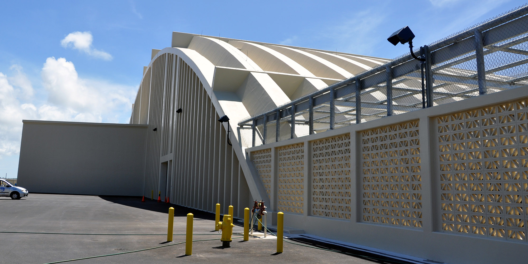 The work included reinforced concrete footings and floor slab, pre-cast concrete arch roof, pre-cast architectural concrete, CMU, fluid applied elastomeric roofing, steel sliding hangar and tail doors, building finishes, hangar floor coating, fire suppression/detection system, intrusion detection system, overhead electric cranes, A/C, and electrical/communications systems. Site work included the connecting of utilities, storm drainage system, sewage lift station, pump building and water supply tank, asphalt and concrete pavement, exterior lighting and incidental site work.