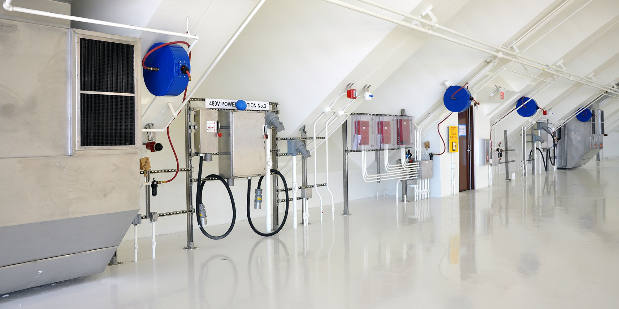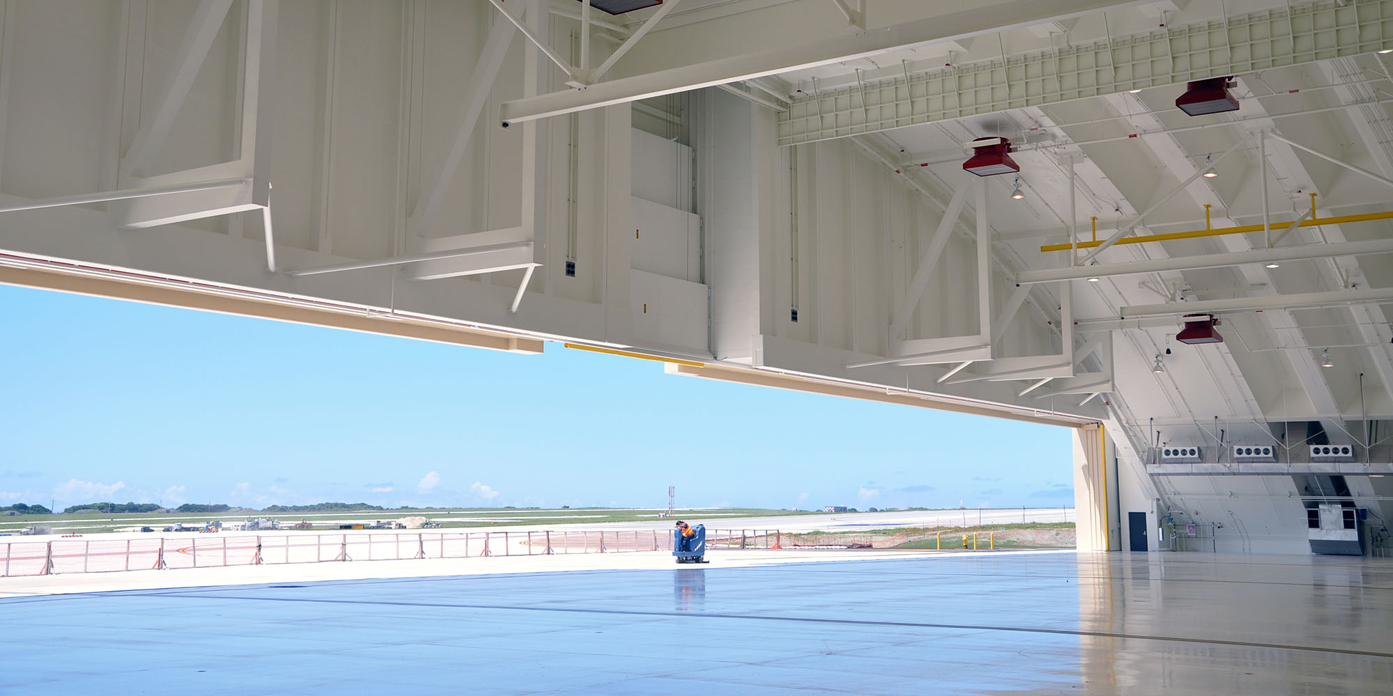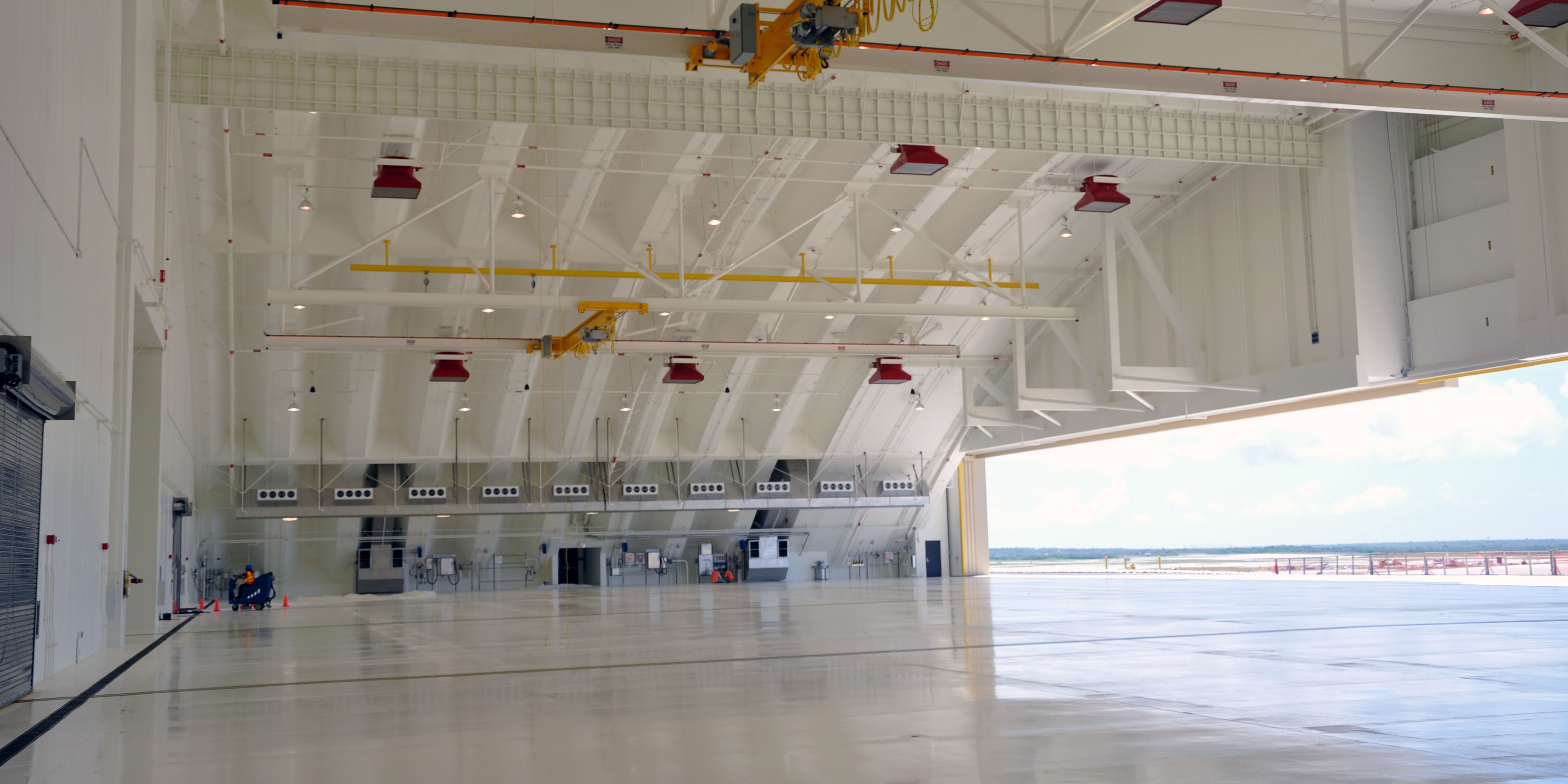 The work included reinforced concrete footings and floor slab, pre-cast concrete arch roof, pre-cast architectural concrete, CMU, fluid applied elastomeric roofing, steel sliding hangar and tail doors, building finishes, hangar floor coating, fire suppression/detection system, intrusion detection system, overhead electric cranes, A/C, and electrical/communications systems. Site work included the connecting of utilities, storm drainage system, sewage lift station, pump building and water supply tank, asphalt and concrete pavement, exterior lighting and incidental site work.