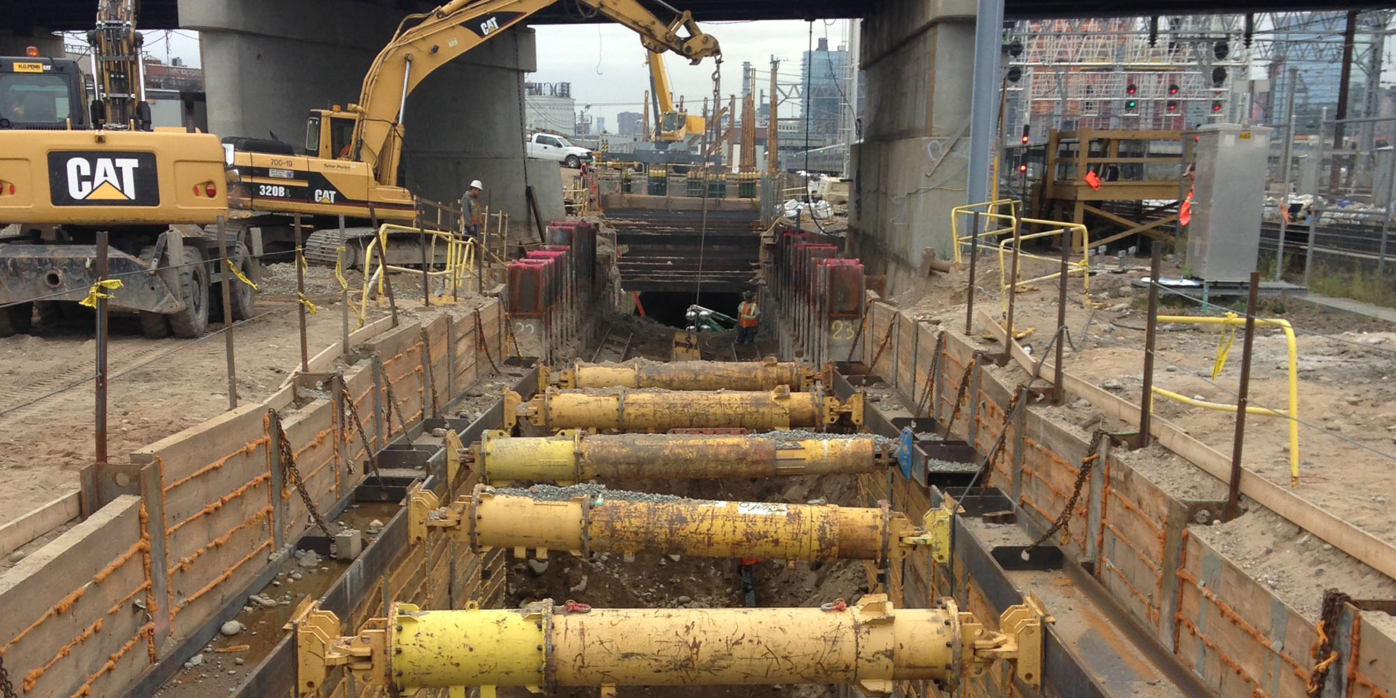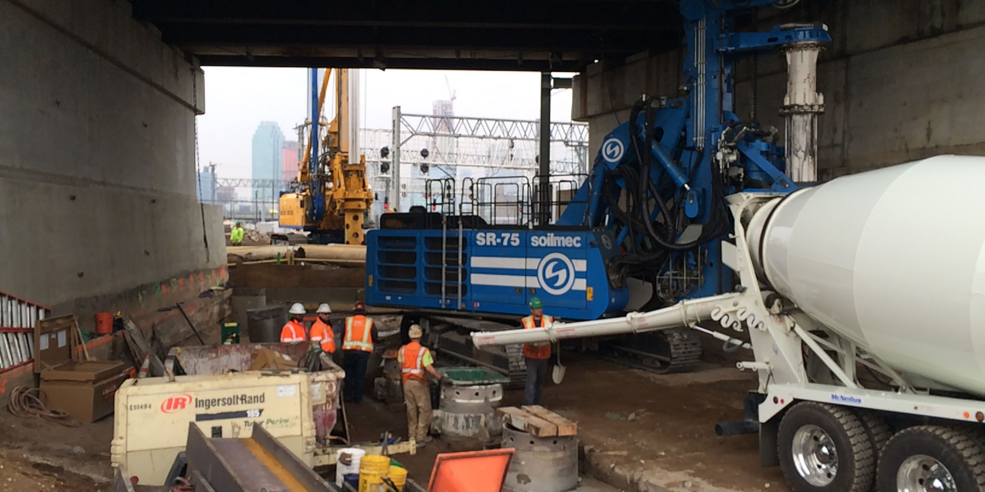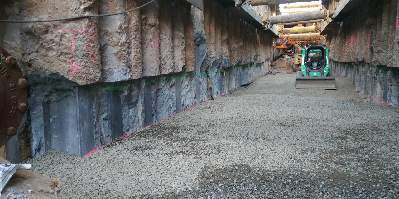The work included two retaining walls, 740-foot cut and cover tunnel for Track D approach structure, one-half mile of trough installation, demolition and replacement of 48th St Rail Bridge, track and switch installation, and secant piles for support of the below-ground rail lines.