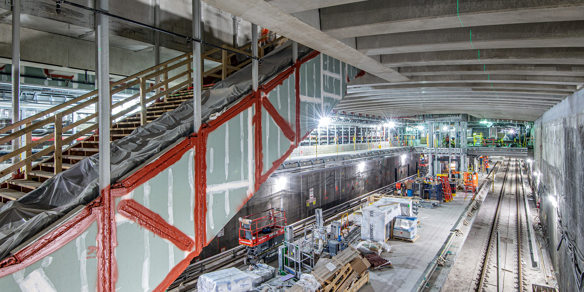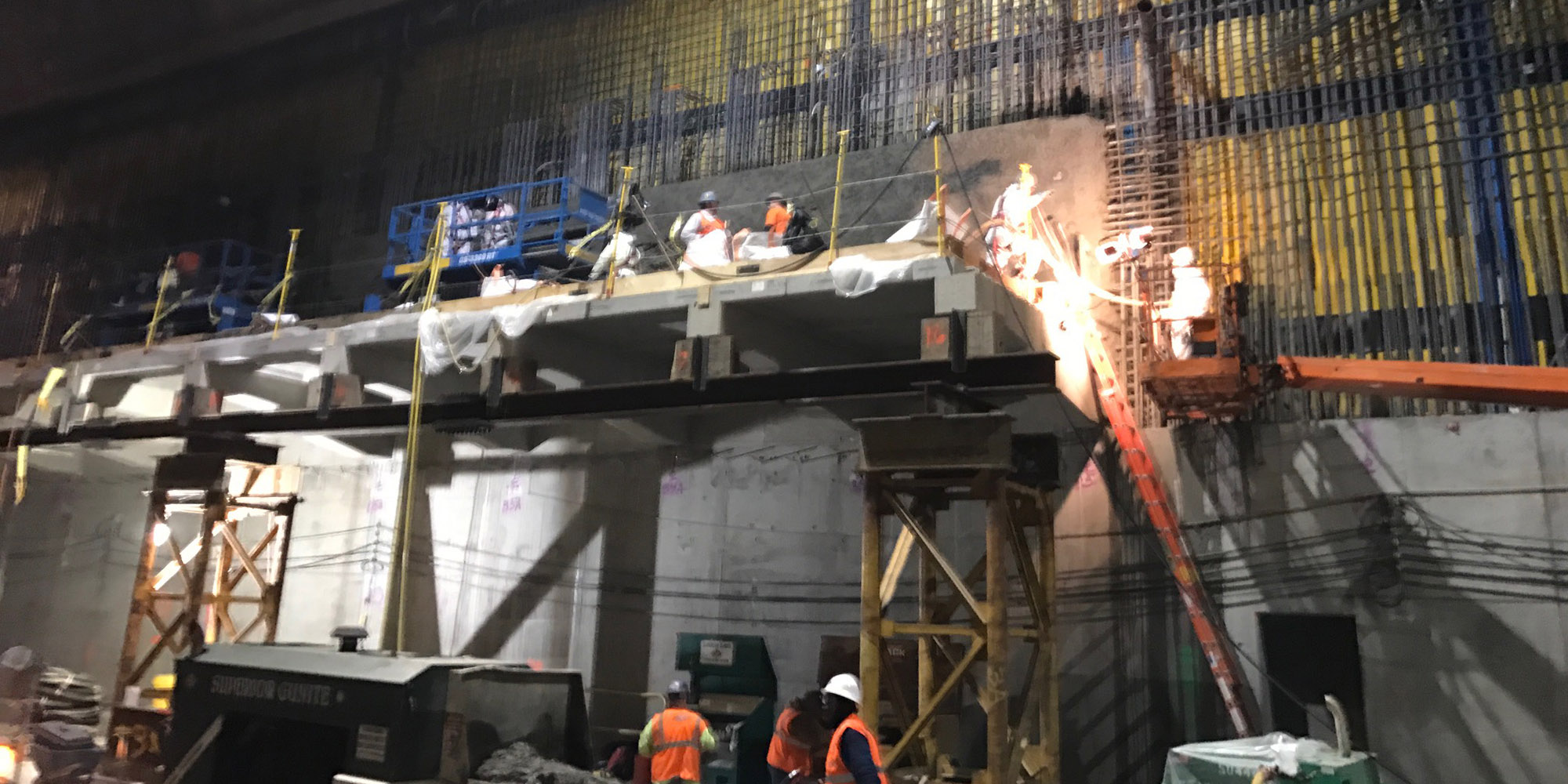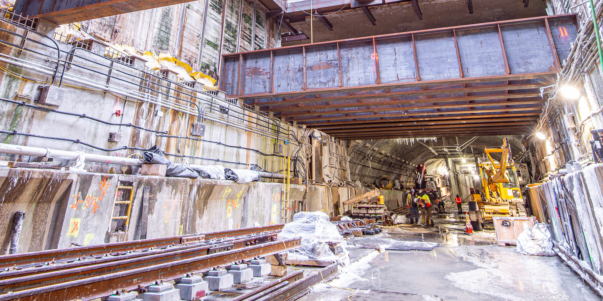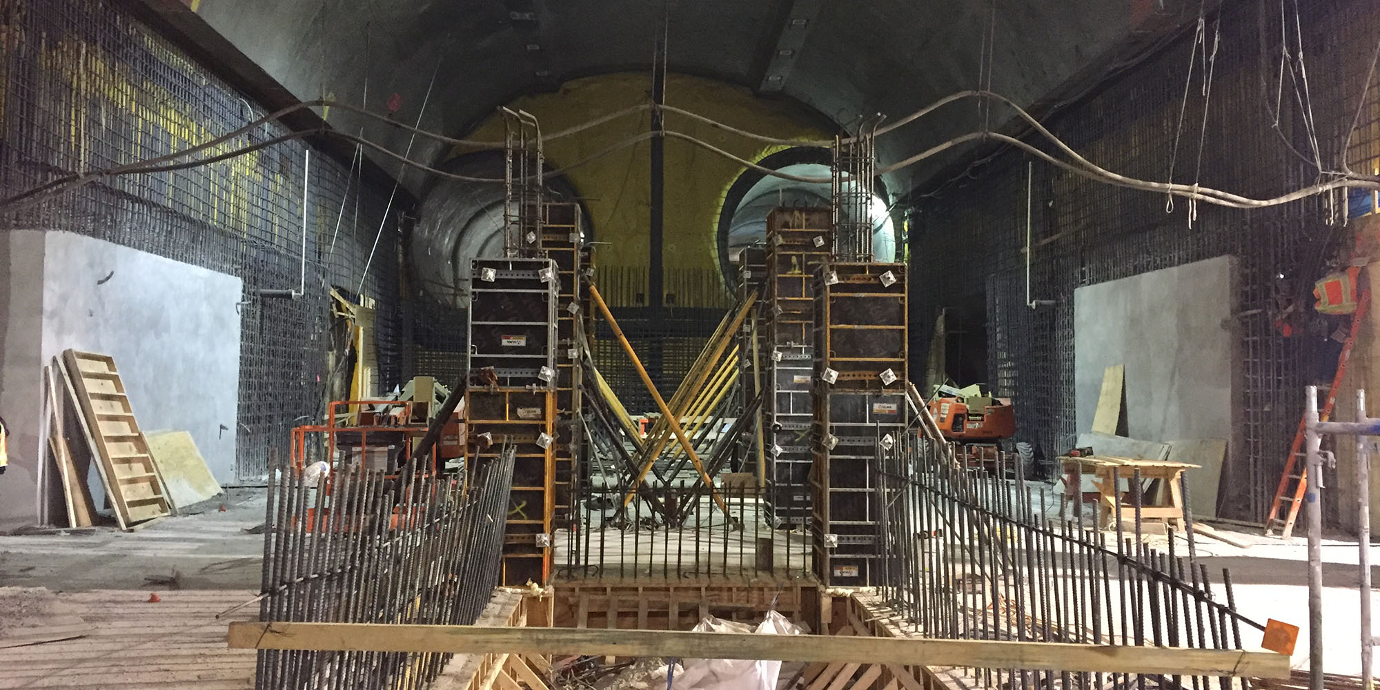 This project included construction of the Grand Central Terminal Station Caverns and installation of the track and special track work in the tunnels and GCT Caverns. The Cavern work included fabrication and construction of the permanent structural concrete lining, interior structures, and fit-out of the cavern spaces. The contract also included installation of all track, special track work and third rail from the south end of the stations through the GCT Caverns, and through the tunnel portals in Queens. The contract work in Queens Bellmouth included closure and backfill of the existing open tunnel structures and backfill of the structures and the site.