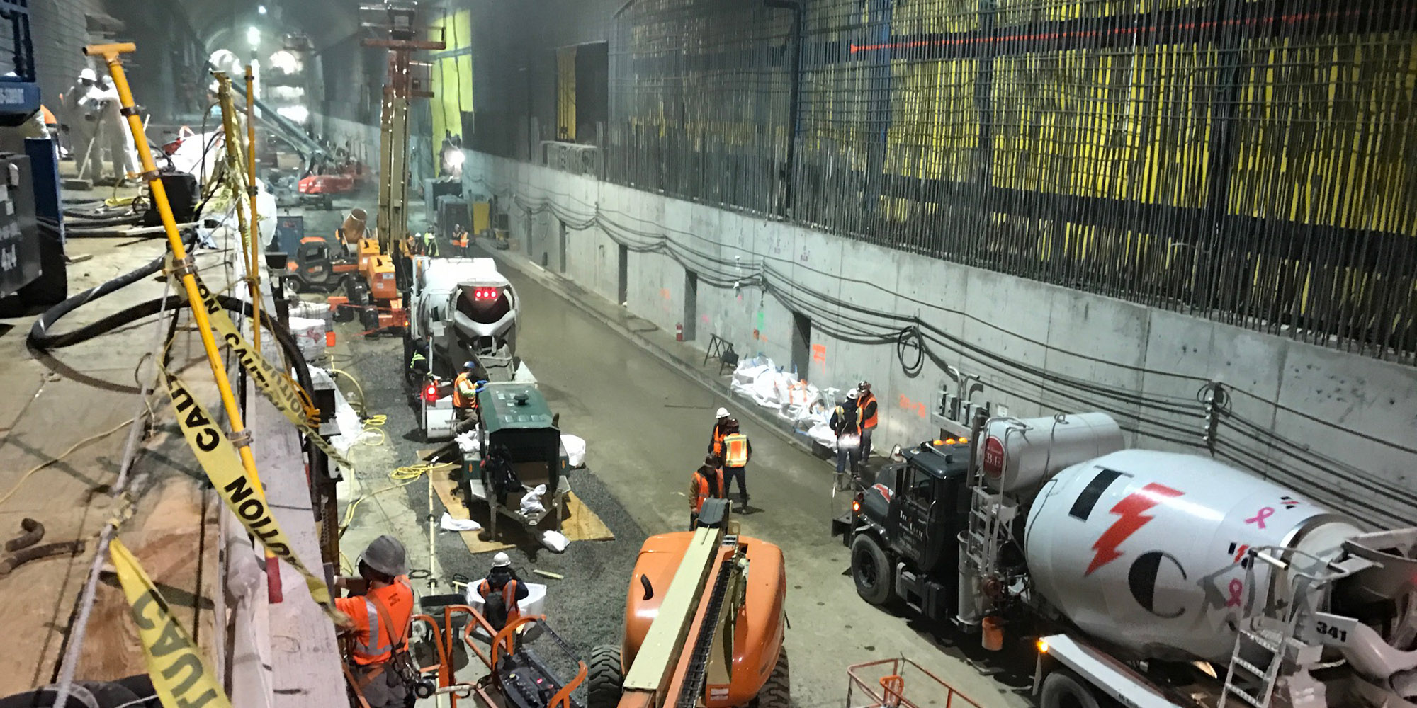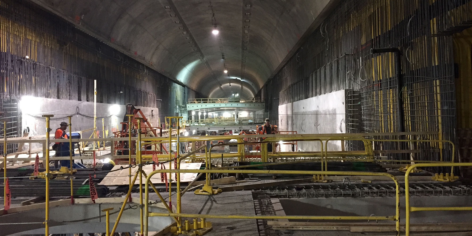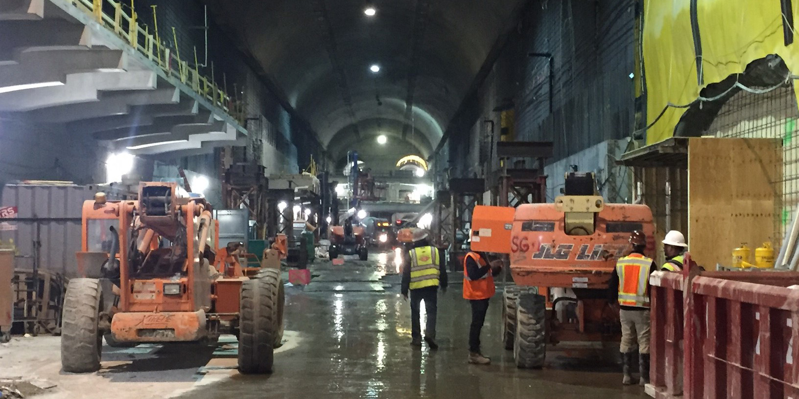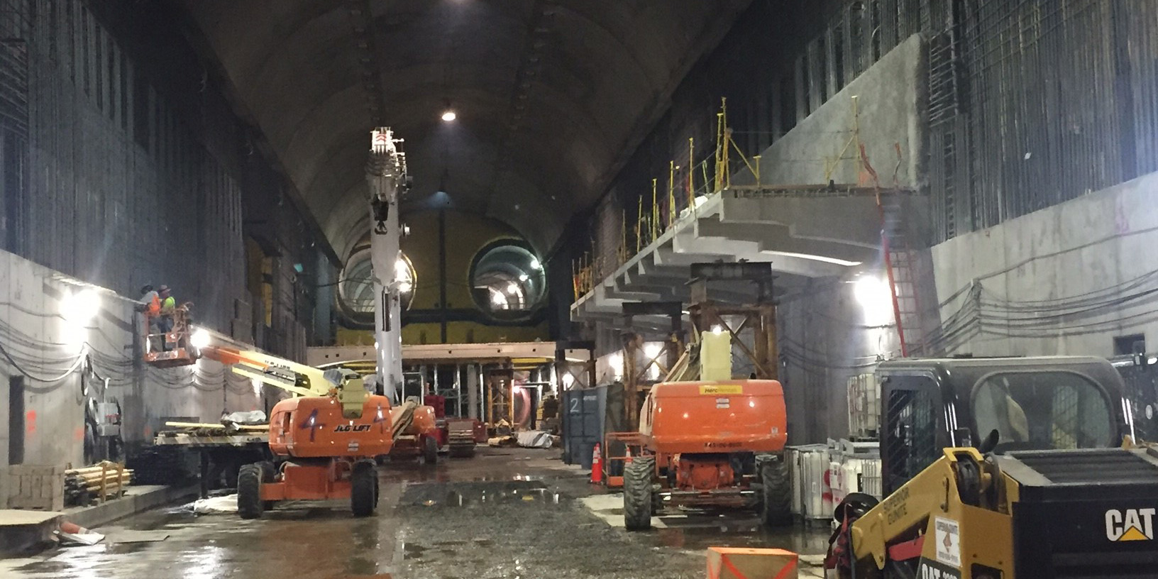 This project included construction of the Grand Central Terminal Station Caverns and installation of the track and special track work in the tunnels and GCT Caverns. The Cavern work included fabrication and construction of the permanent structural concrete lining, interior structures, and fit-out of the cavern spaces. The contract also included installation of all track, special track work and third rail from the south end of the stations through the GCT Caverns, and through the tunnel portals in Queens. The contract work in Queens Bellmouth included closure and backfill of the existing open tunnel structures and backfill of the structures and the site.