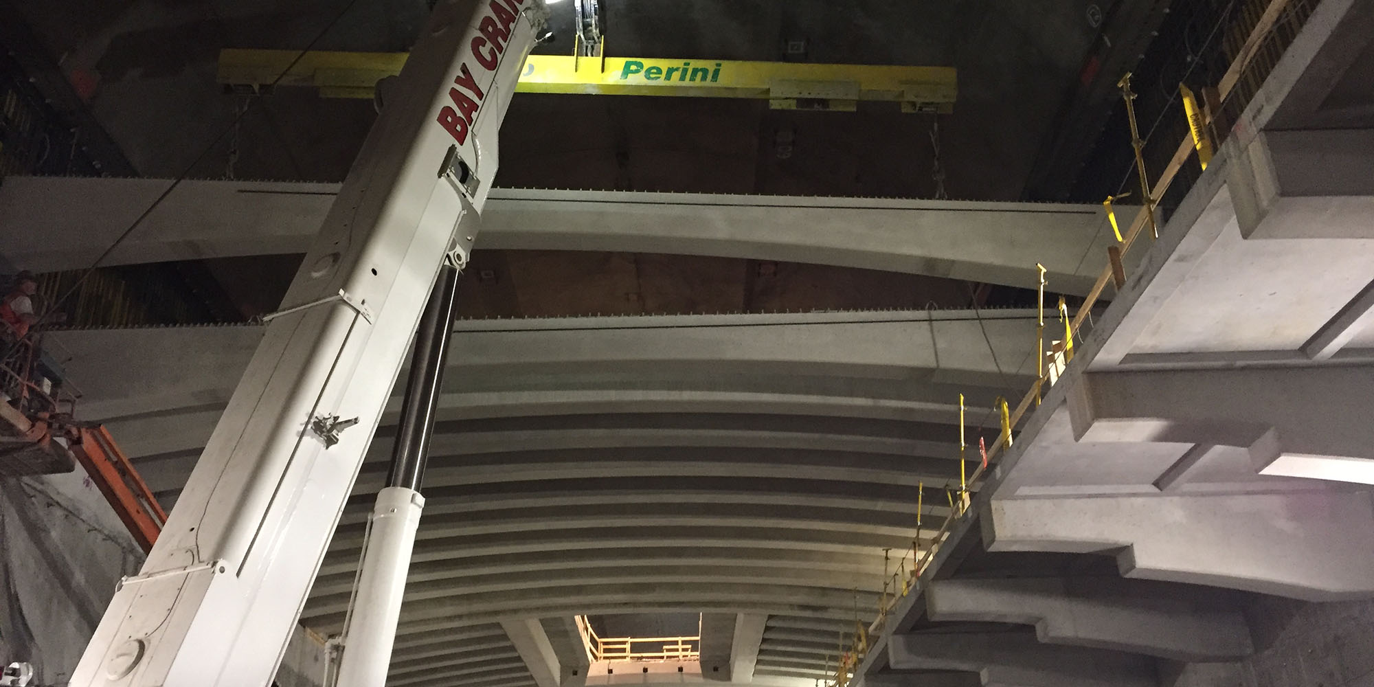 The scope of work also included structural precast fit-out of two 1000-foot existing caverns with 830 precast beams, 844 precast panels, 694 precast walls, and 370 precast platforms.