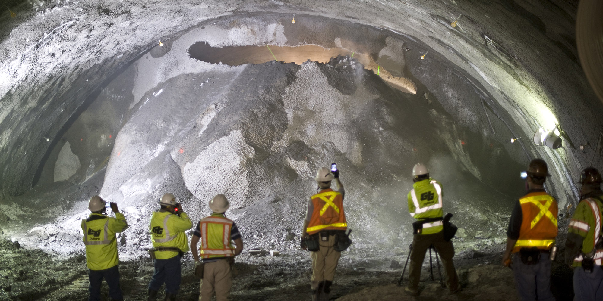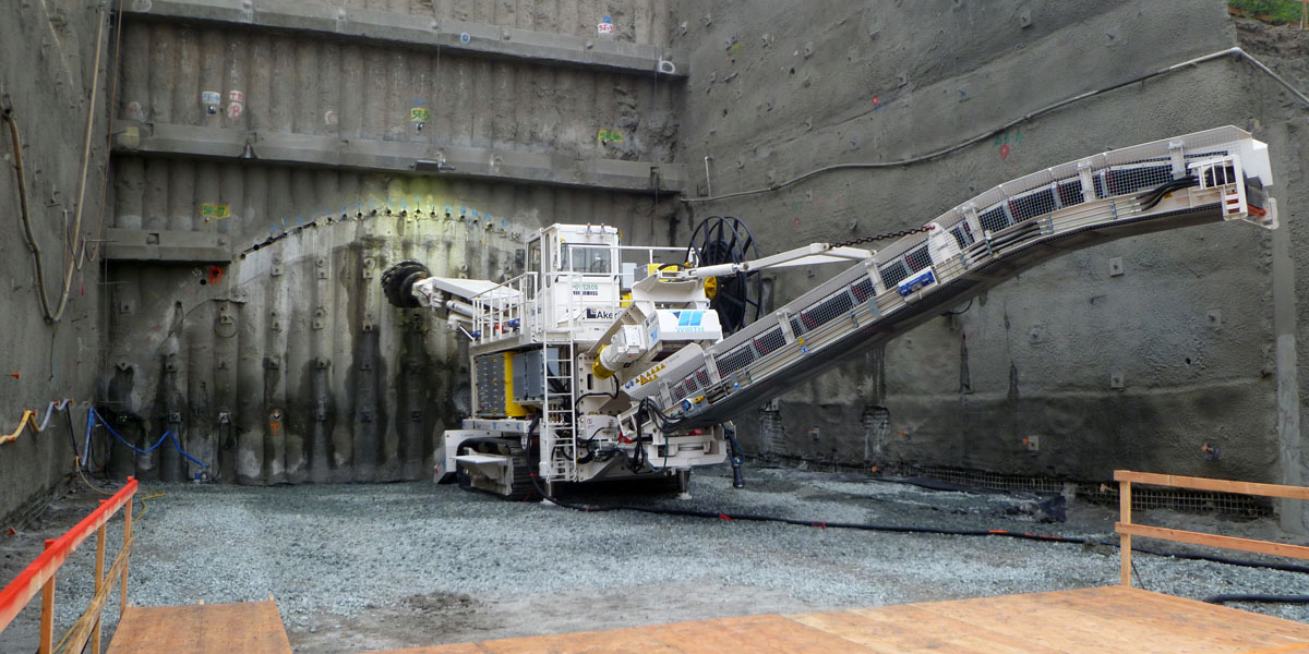 Construction was based on using the Sequential Excavation Method (SEM), and the use of shotcrete, rock dowels, lattice girders, and grouted steel piles in various combinations to provide initial support. The excavation sequence utilizes a full-width top heading and a full- or split-bench excavation behind the heading excavation. Some sections of the tunnel required a shotcrete invert arch in both the top heading and at the base of the bench excavation. The final lining system for the tunnel consists of reinforced cast-in-place concrete backed by a waterproof membrane and a drainage fleece.