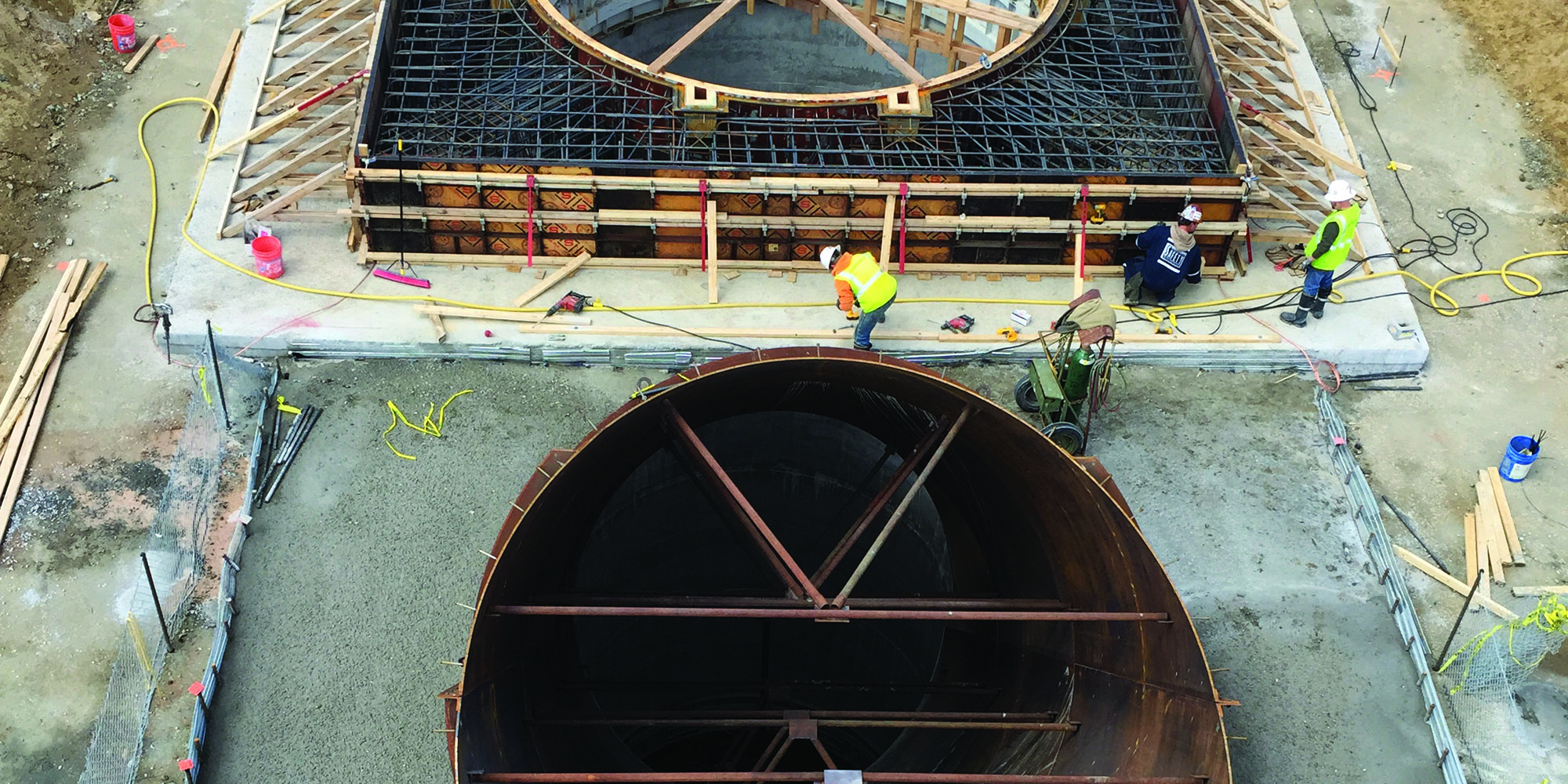 This project involved the design and construction of a 22-foot (inside diameter), dual-compartment, concrete-lined shaft. The shaft was constructed using the bore and slash method.