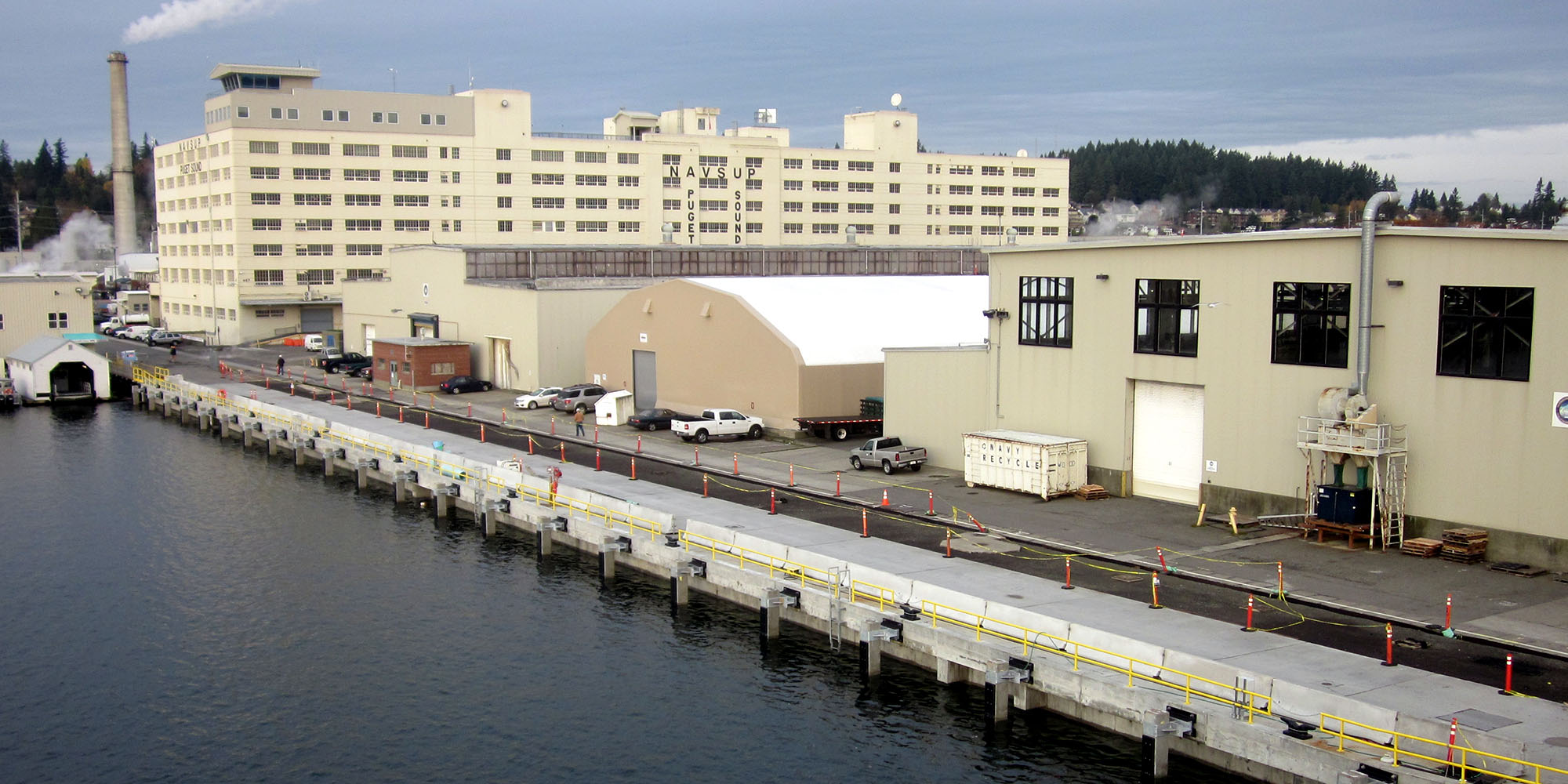 This design-build project took place at CVN Maintenance Pier Replacement at Naval Base Kitsap in Bremerton, Washington. The project demolished the existing Pier Bravo (60 feet by 1200 feet) and designed and constructed a new ship repair wharf (85 feet by 1325 feet), including the replacement of approximately 600 lineal feet of quay wall (Structure 729), the strengthening of the 1000-lineal-foot sheet pile wall west of the Dry Dock 6 mole, and the demolition of Pier 8 (60 feet by 400 feet).