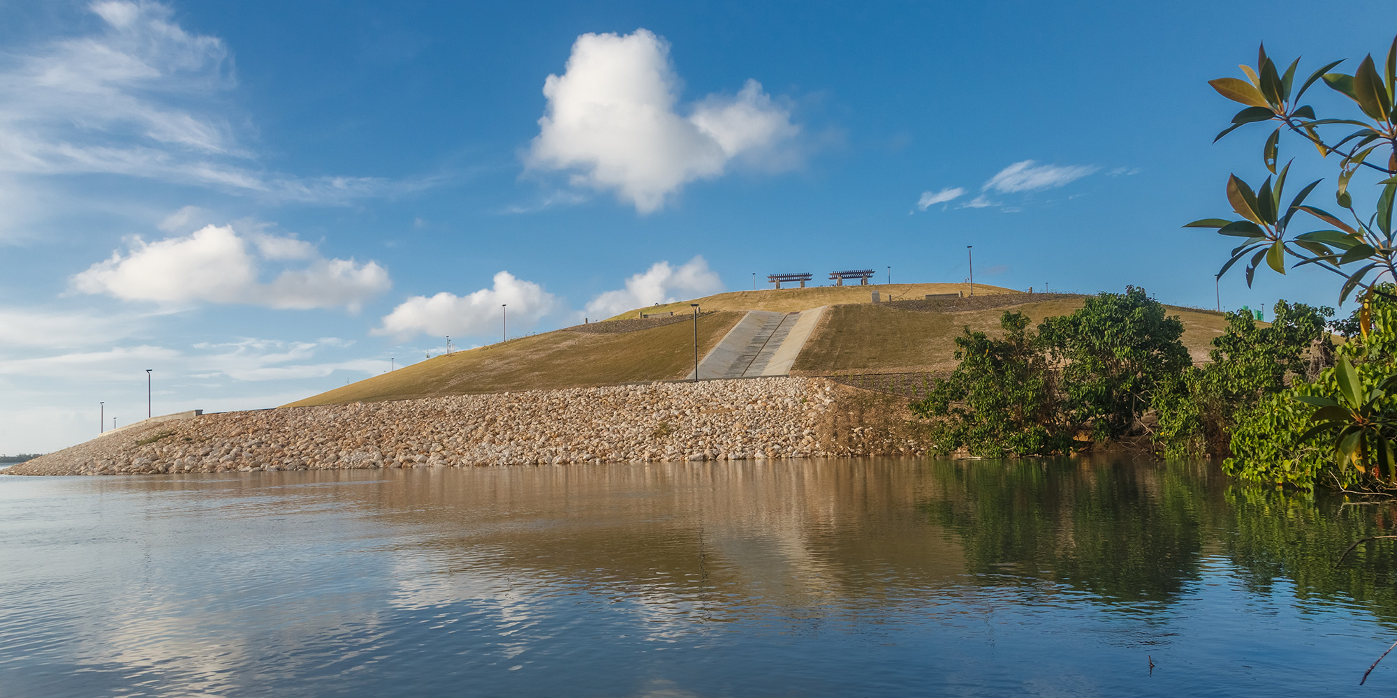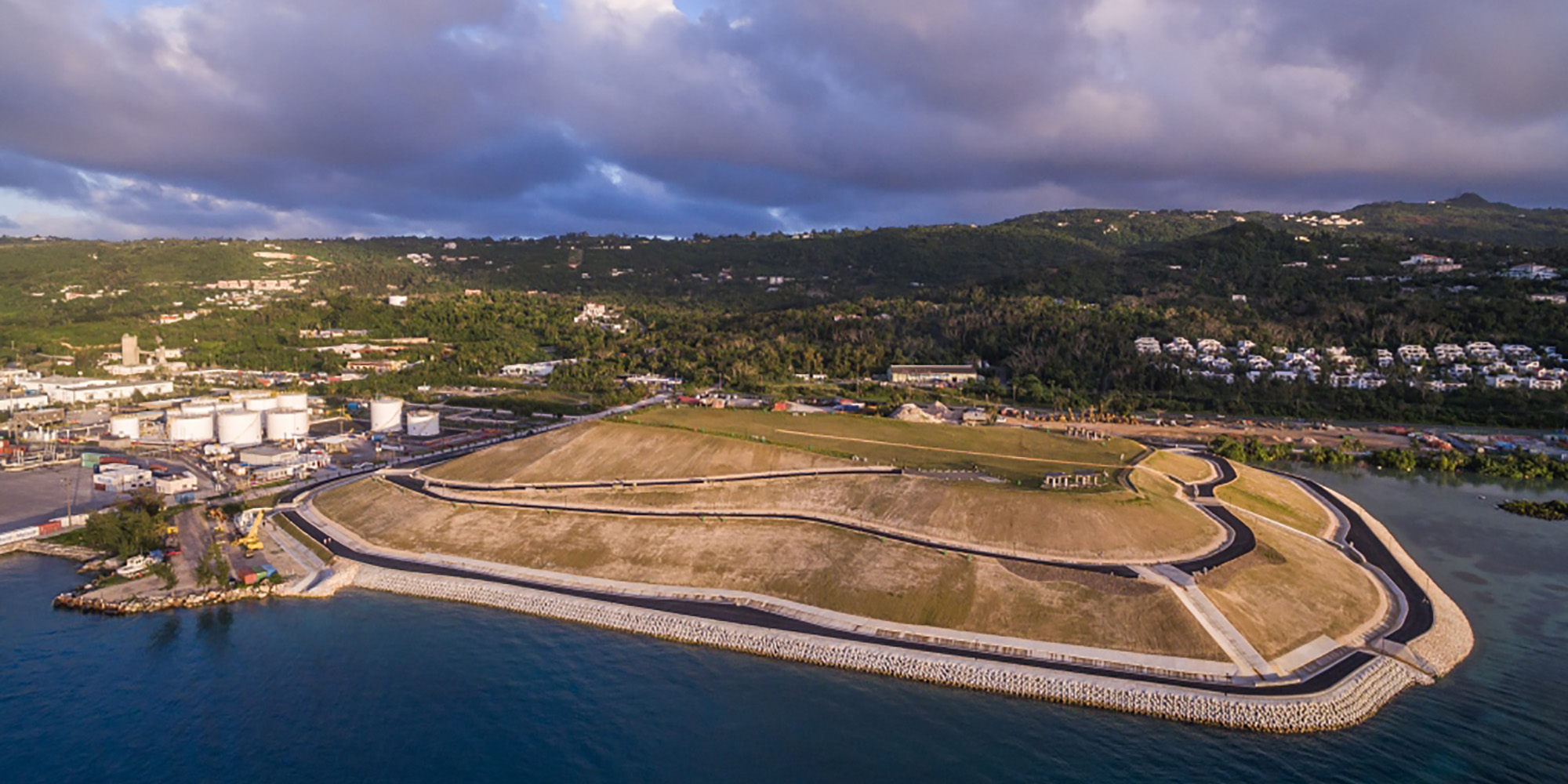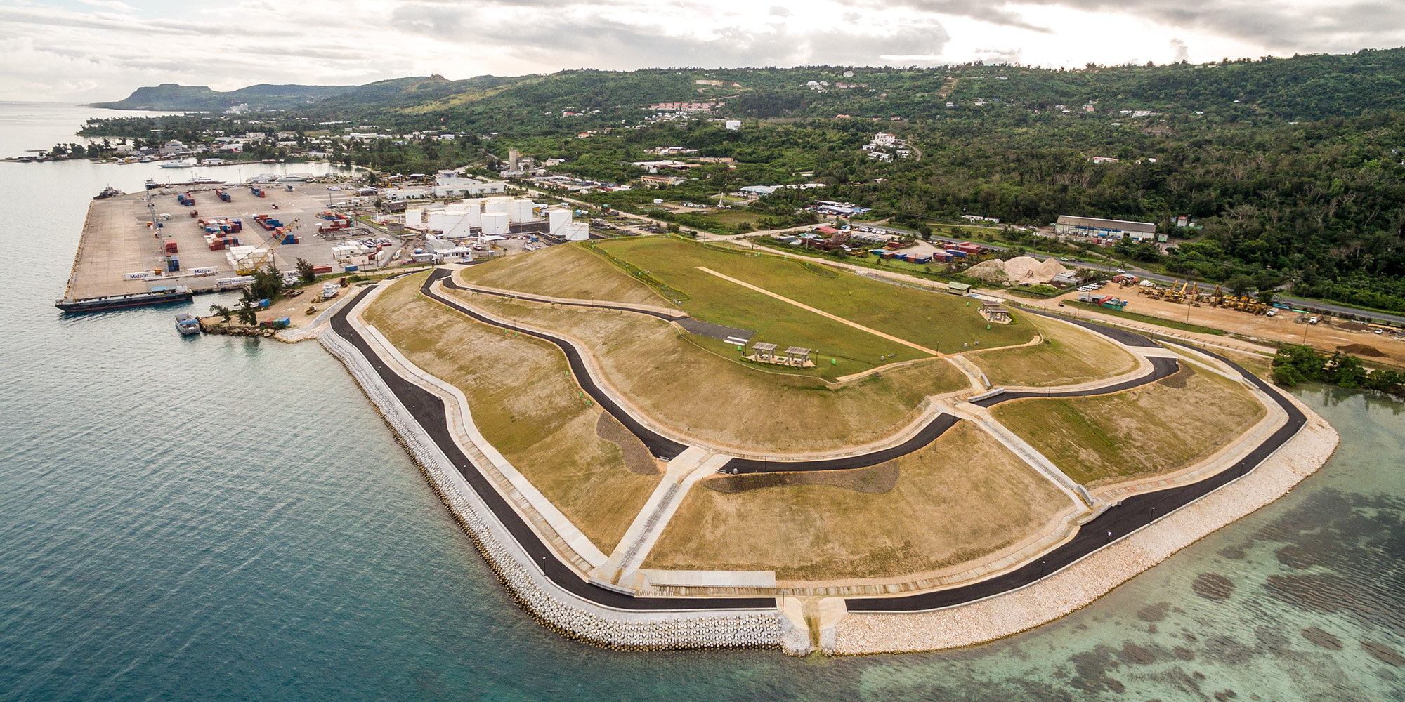 The Puerto Rico Dump was located adjacent to Saipan Harbor at the northwest side of Saipan and was closed and capped under this contract. As a part of the dump closure, this project included the conversion of the dump into a passive park with landscape/hardscape elements as well as a relief area on the top deck for events. Additionally, a restroom was constructed on the southeastern face of the dump near to Industrial Drive.